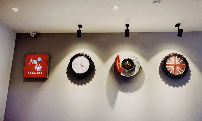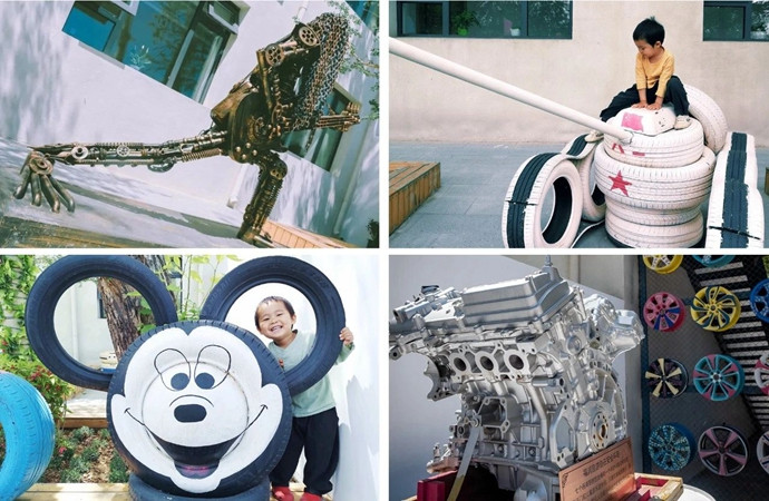 当车子缓缓驶进院子,集装箱式主楼率先映入眼帘,蒸汽火车头造型的门岗亭,让人瞬间穿越时空。路上不乏轮胎花坛、汽车零件造型,而院里还有创了吉尼斯记录的6.2米巨型铜线轮胎最为憾人!
