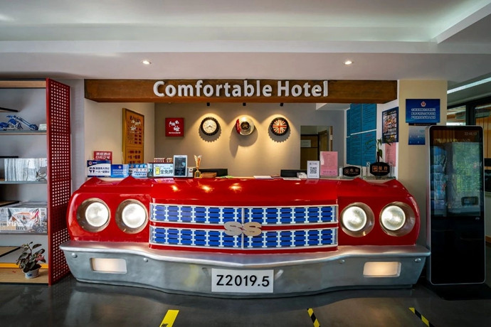 凡是入住客人,都要先去主楼的一层前台入住登记,红色复古车头着实吸睛,车头灯可亮、笛可鸣,十分酷炫。楼道两侧则是流畅公路的视觉,房间号也采用了车牌设计,别具一格!