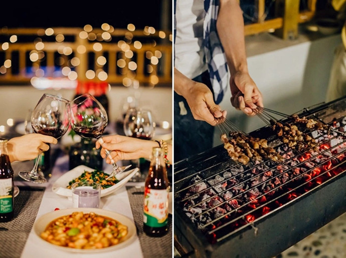 餐厅二楼的露台,午后日落就是烧烤趴最盛的时候!小烤炉,大烤箱,能够满足各色肉串、羊排、海味。夏日的夜晚,星辰漫天,左手干杯,右手撸串,一起在星空下谈笑疯闹,彻底忘掉都市生活的喧嚣烦恼。