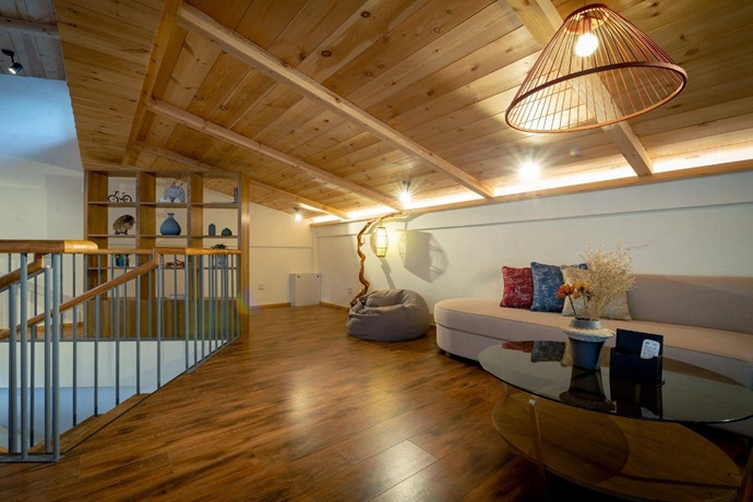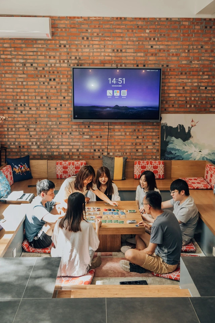 阁楼下方则是面积较大的共享空间,下沉式地台足够容纳十个人围坐游戏,另一边长桌旁有麻将机、泡茶机,休闲多样,很适合放松。