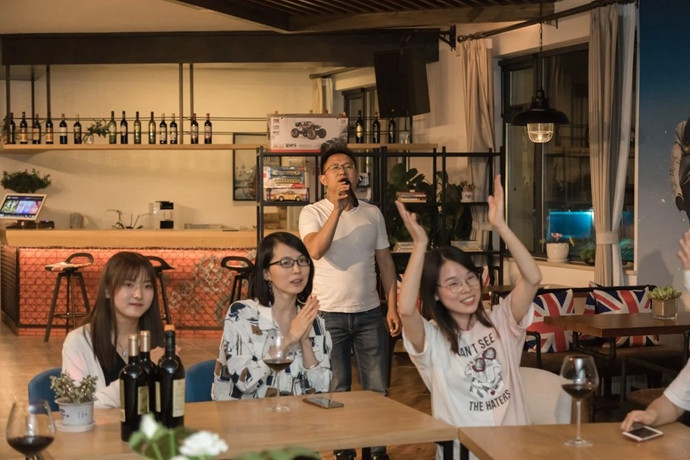 主楼三层的多功能厅,空间明亮宽敞。开会时,它是具备百余桌椅、投影幕布齐全的会议厅;休闲时,转身又变成灯光摇晃、音响绝佳的KTV;且室内配备小吧台、高脚椅,红酒微醺中闲聊,别有情调。