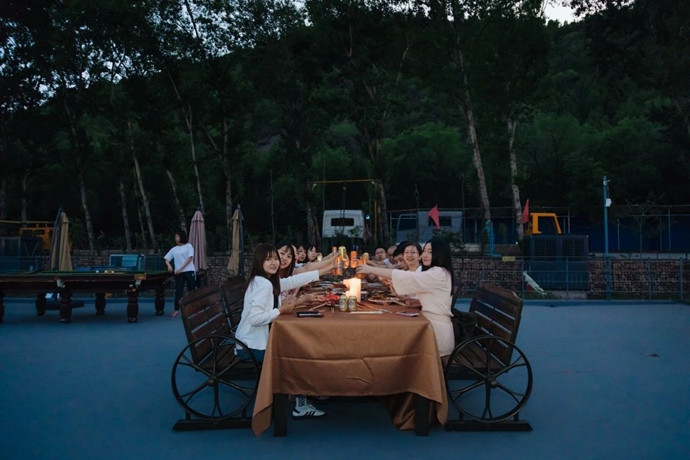 聚会八九不离食,民宿的汽车主题餐厅里,一层是一个能容纳百人的公共餐厅,四个包间;二层则是更大的屋顶露台,是烧烤、游戏的最佳场所。
