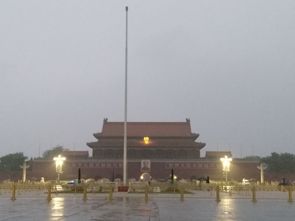 次日的行程早告知:看升国旗和爬长城,想想都激动。这两项恐怕是每一个中国人到北京都必须优先要做的事罢。早上3点20起来,简单吃了个早餐,4点准时出发前往天安门。没想到北京的天亮得这么早,四点过就已鱼肚白,过了安检,来到天安门广场升国旗的地方,用围栏隔了一圈,七八个军人毕直地站成一排,现场人数不算多,估计也就几百人的样子吧,比起平时的人山人海来,今天到场的每个人都可以站在围栏的第一排观看,实在幸运。约5点10分左右,从天安门城楼下面走出了三军国旗队,可惜相隔太远,用手机拉近了看也只能看出些影子来,但国旗队整齐铿锵的步伐还是听得一清二楚,要说军人还真是干净利落,还没调整好拍摄,雄壮地国歌声已然响起,在空旷寂静的天安门广场上显得格外嘹亮,可能多数人都想用手机现场记录下这一庄严神圣的时刻,所以想象中大家一起同声高唱国歌的情形最终没有出现,事后在拍摄的视频里倒是有听到个别跟着吟唱国歌的声音,当然,这当中也包括我自己,只可惜没能勇敢地大声地唱出来!但心底的豪情还是油然而生。想起若干年前,有同事来北京天安门看升旗,还能登上开国大典的天安门城楼,还有时任北京的市长亲笔签名的纪念证书,听导游讲,这项服务已经取消很多年了。天公不是特别作美,灰蒙蒙一直飘着细雨,但还是在雨中拍了个不亦乐乎,只为证明我曾经来过,这可是一生的记忆啊。