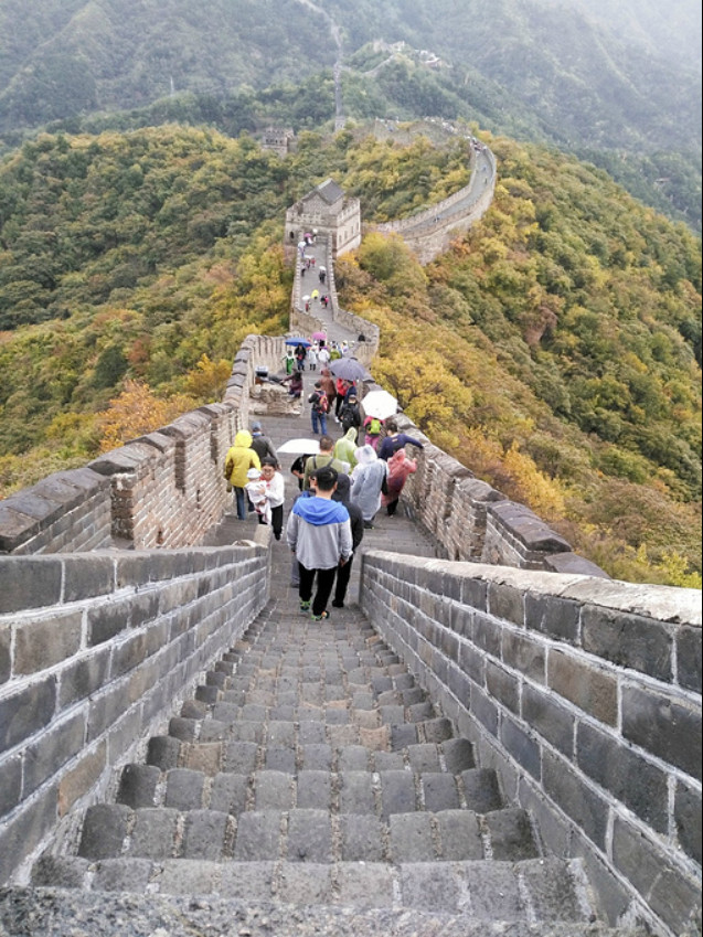 我去得比较早,各种拍拍拍,拍得差不多了人开始多起来,尽管那天比较冷,还下着小雨,毕竟国庆,长城上有人打伞,有人穿雨衣,有人直接裹着厚衣服,人流越来越多,9点的时候已经拍不到没有人的景了。