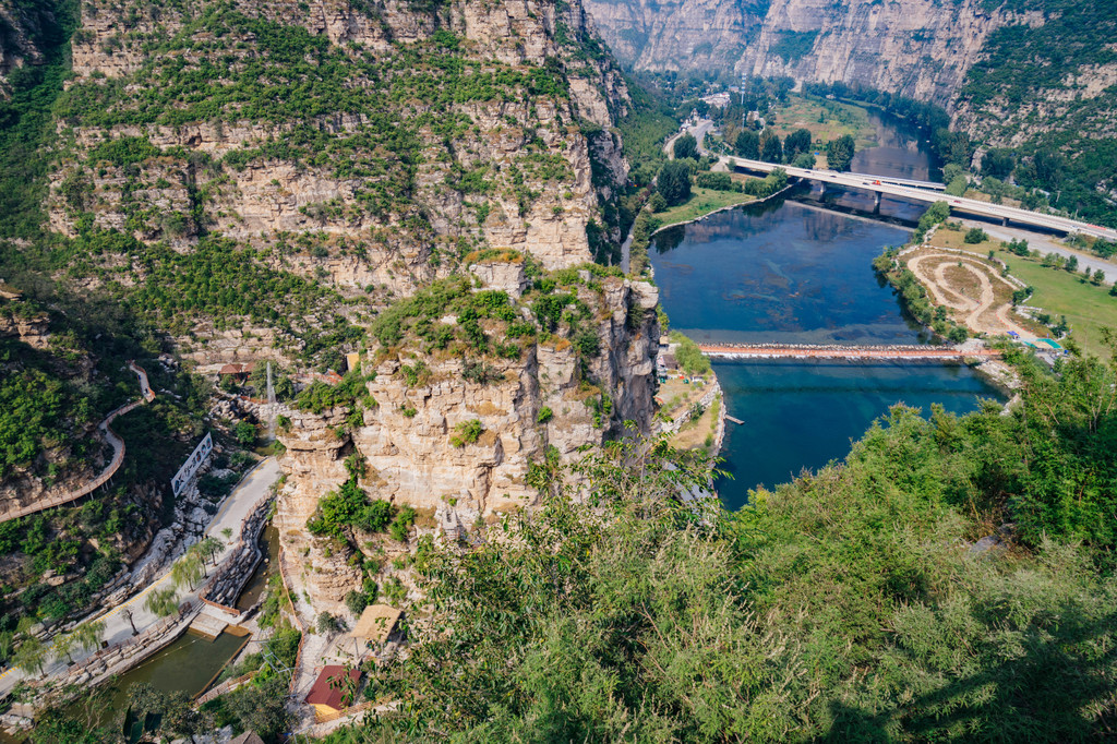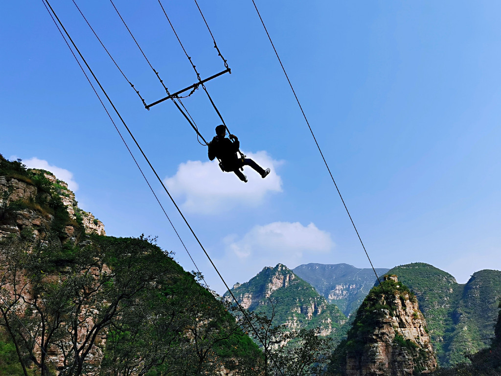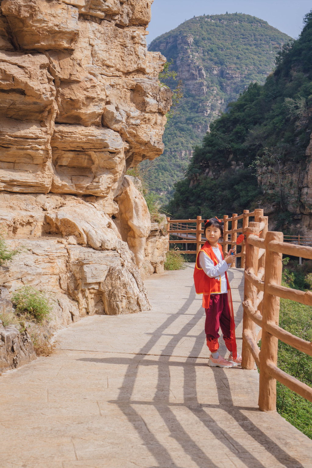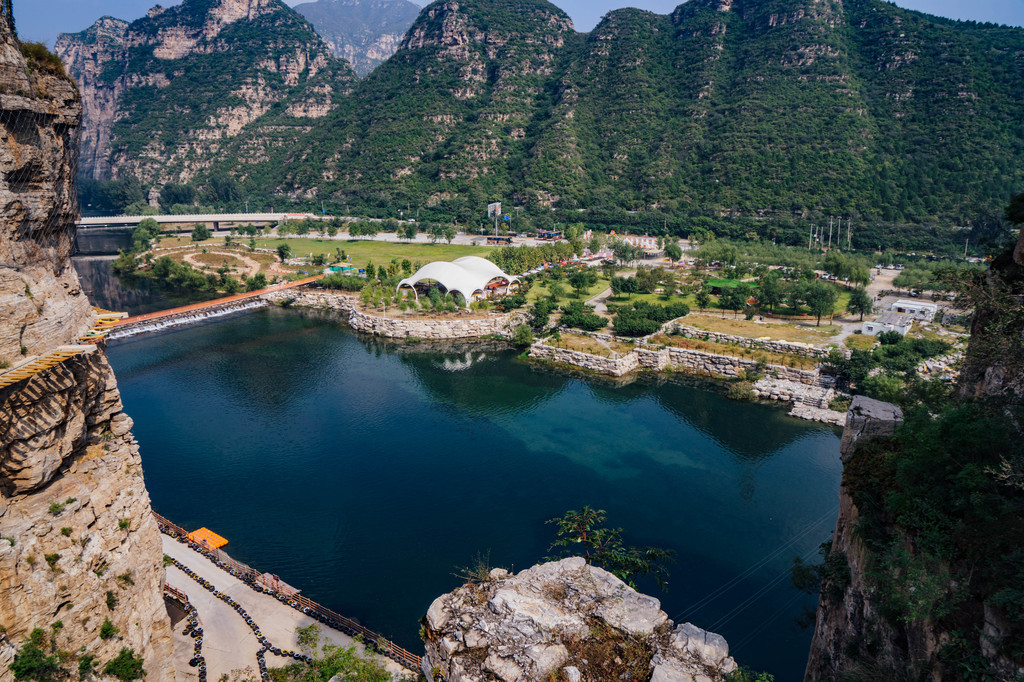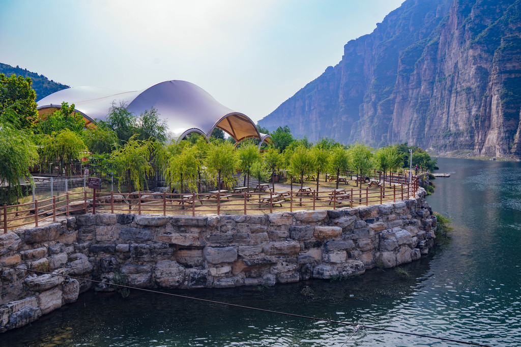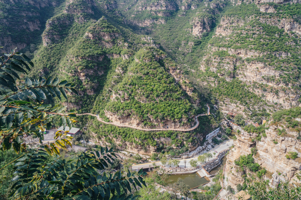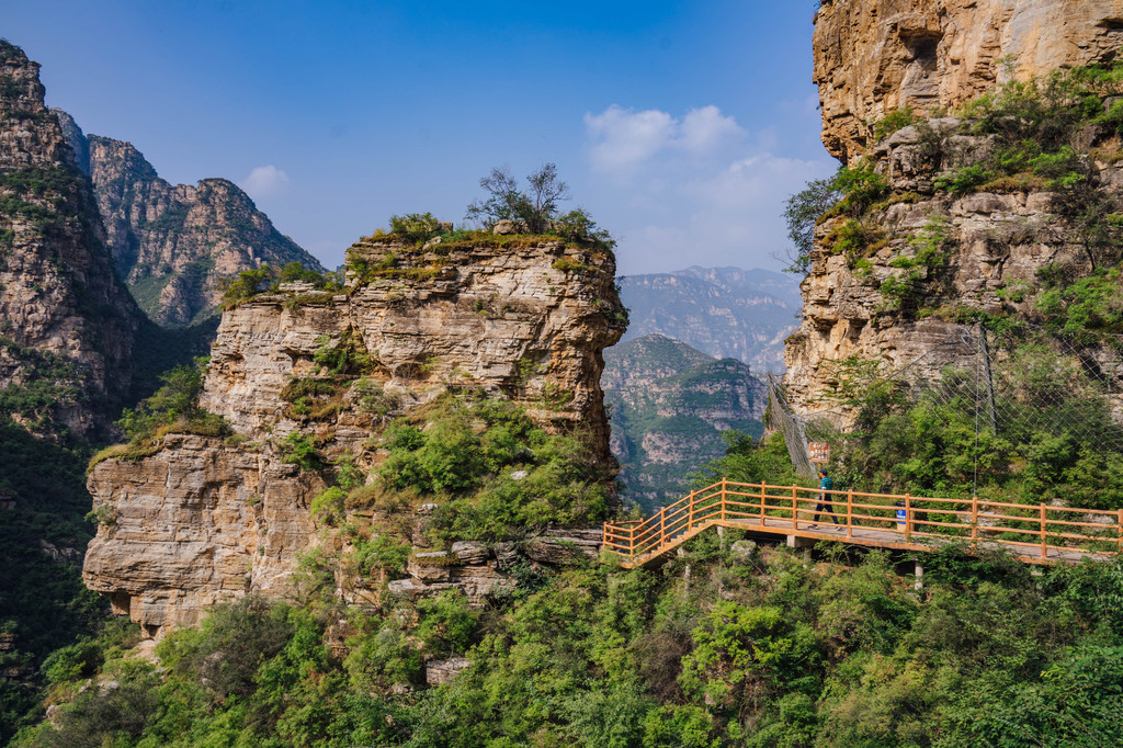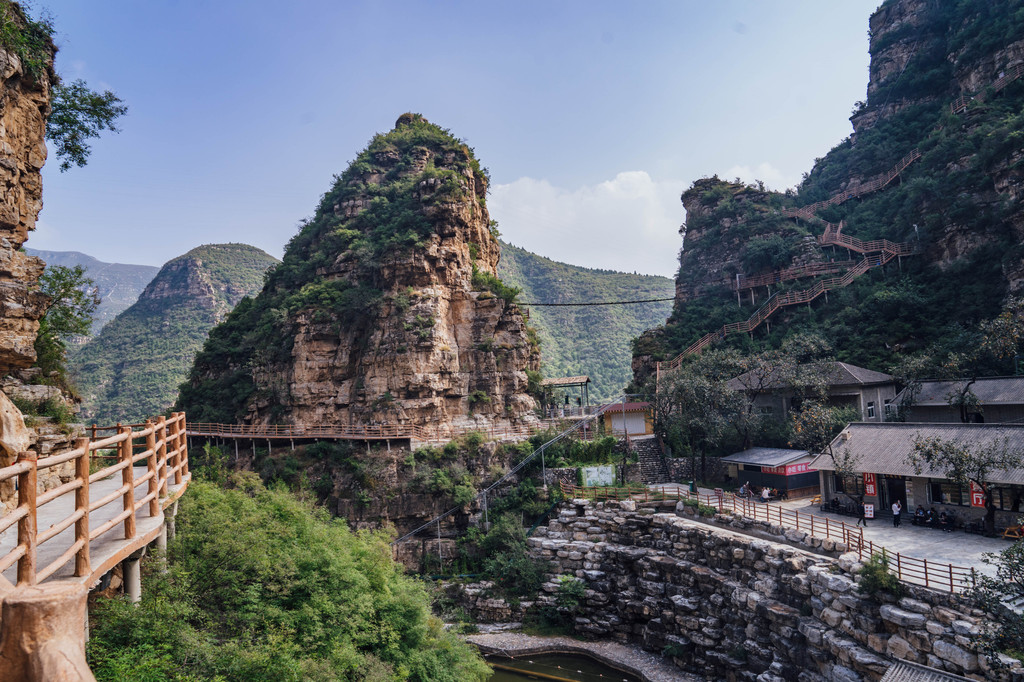 景区内8000多米的登山栈道,一步一景。走入深处,青山对峙,绿树滴翠。而在太行山脉天子峰下的大峡谷当中,有”天子脚下第一漂”,全长约3.8公里,300多个极速叠差。
