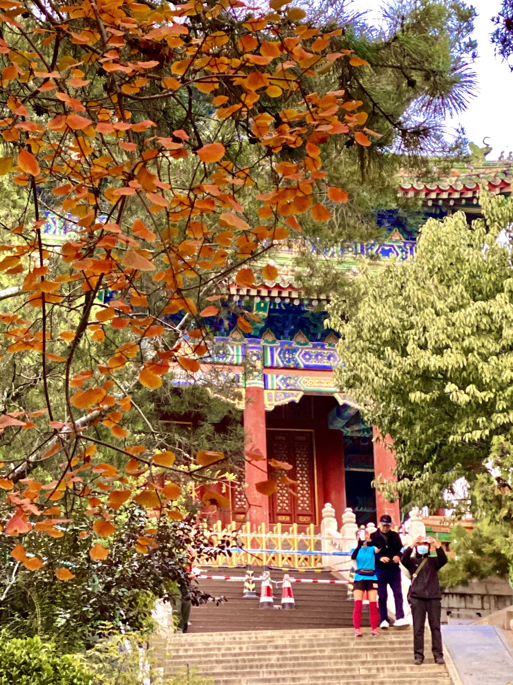 霜降已过,公园内公园内松柏郁郁葱葱,银杏树变黄,菊花盛开,红叶在阳光照耀下透着妩媚。登景山一路上古建筑和远处CBD区域的北京第一高楼中国尊在朝阳中交相辉映。
