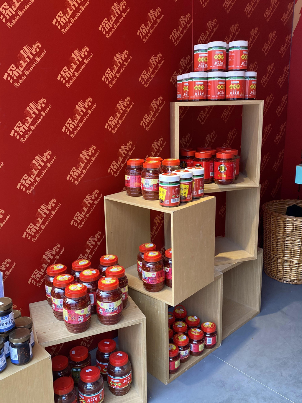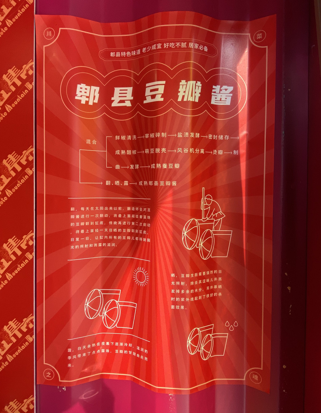 郫县豆瓣酱被称之川菜之魂,这几年成了国民调料。深山集市上介绍了“翻、晒、露”的古法制作工艺,绝对正宗红油郫县豆瓣酱很受欢迎。
