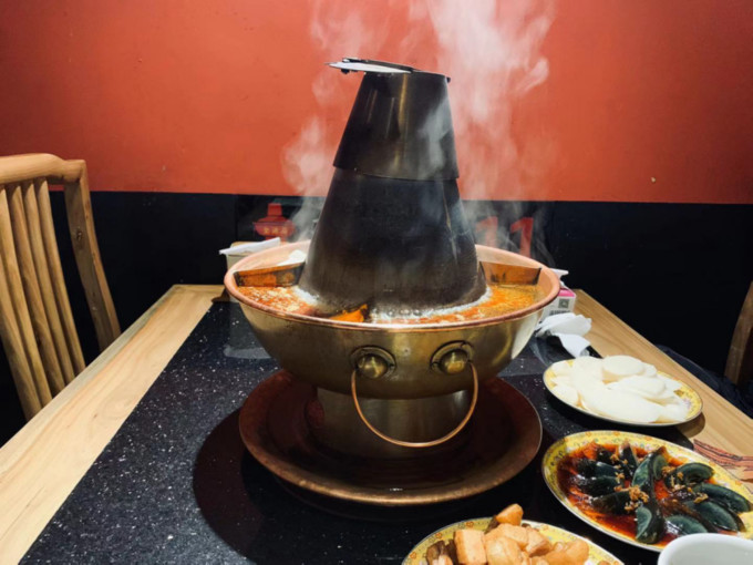 玺源居老北京涮肉热腾腾的铜锅,滋溜滋溜的冒着热气,肉呢,快下锅!