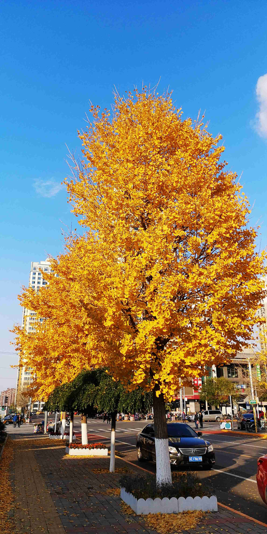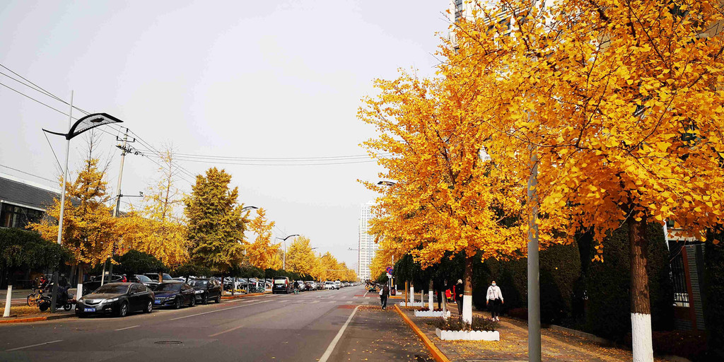 道路两旁高大的银杏树,枝繁叶茂,在阳光的照耀下,金光闪闪,仿佛童话世界一般。