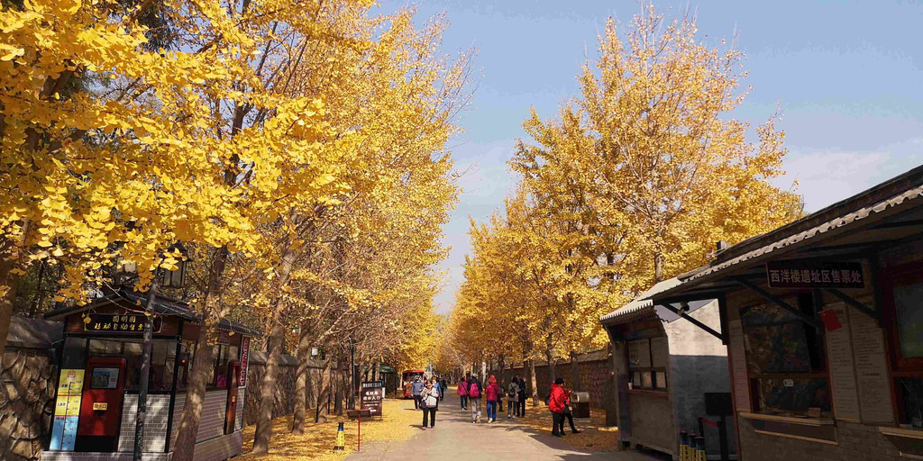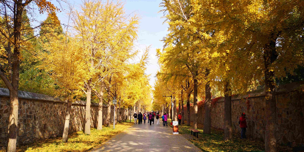 圆明园坐落在北京西北郊,其银杏大道位于三园交界处,长约千米,可谓“最长”银杏大道。