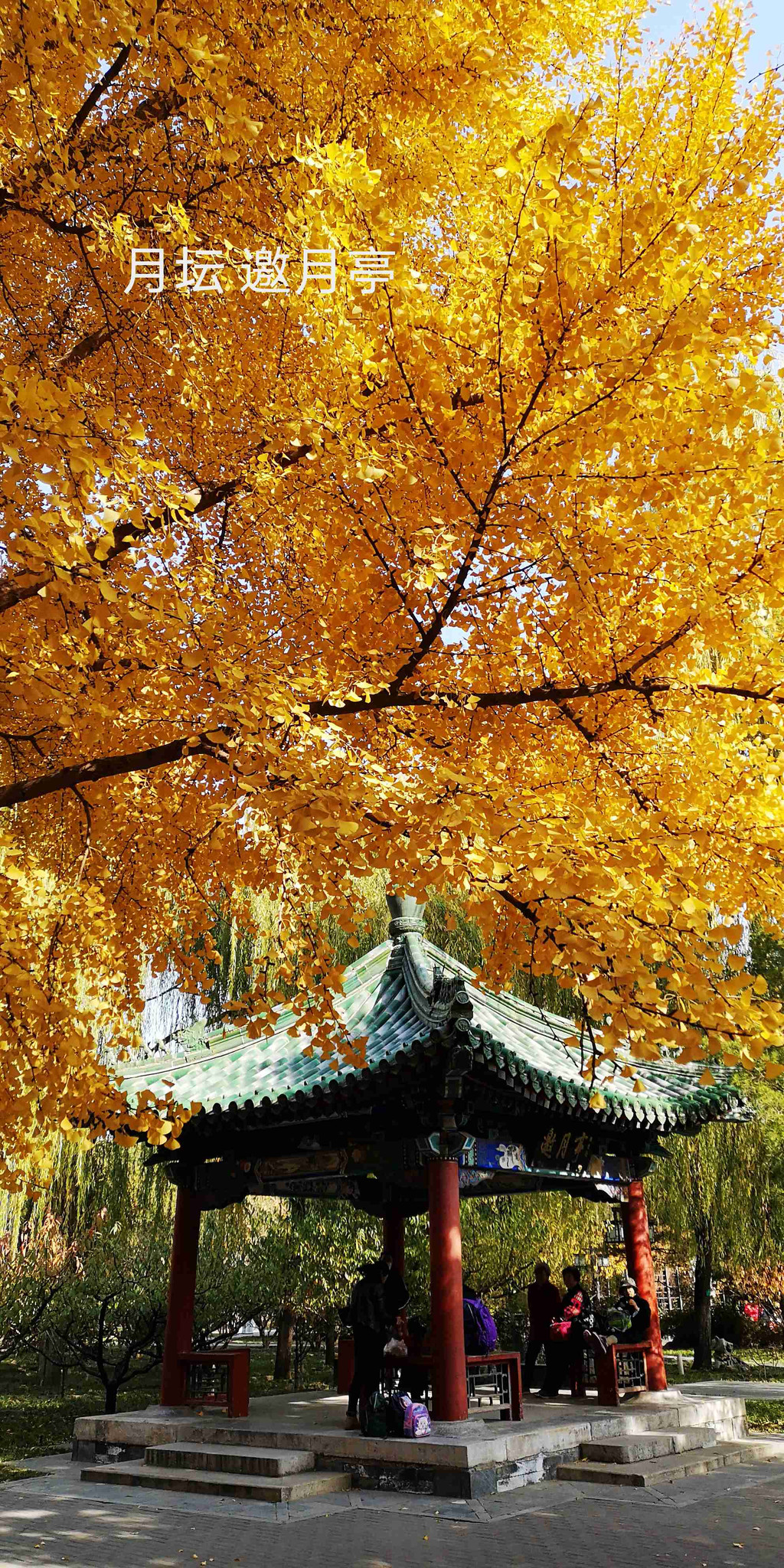 月坛公园墙内外各有一大排银杏,黄灿灿的,与灰墙碧瓦相映成趣。