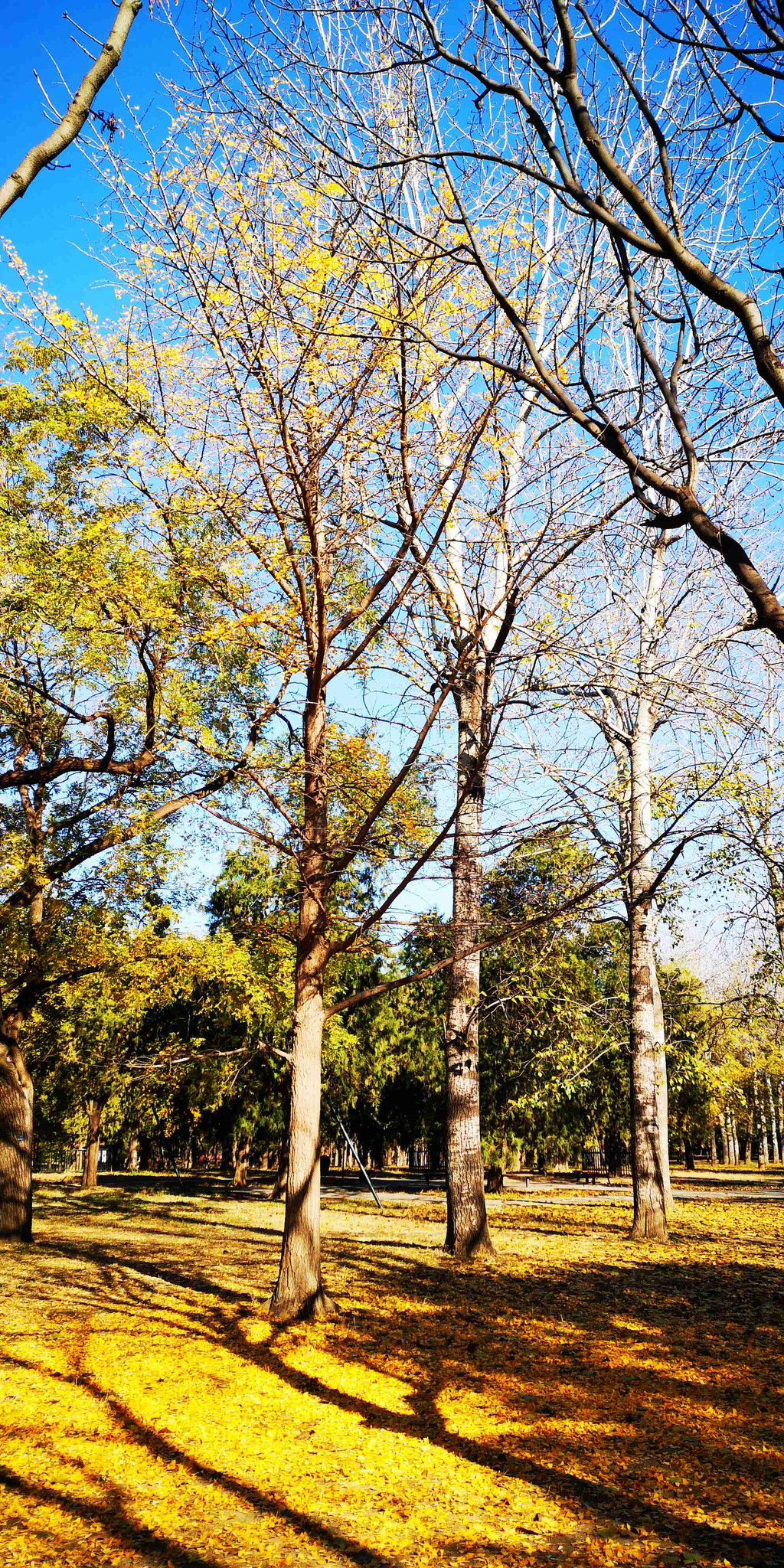 追逐京城银杏,还要讲天时。仅相隔5天,19日,我们再次进入月坛公园,银杏大道变成了另外一番模样,大道成了光叉叉。