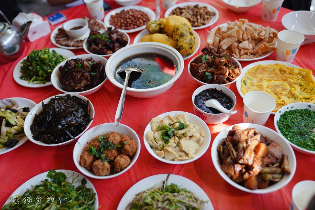 傍晚,在百年古村喝村民在山上手工采集的黄芩茶,吃地道的猪蹄宴。猪蹄肉质肥而不腻,入口即化,炖煮的火候极佳,搭配上农家红烧肉、炖柴鸡、白菜豆泡,还有特别的美食拔丝咯吱。