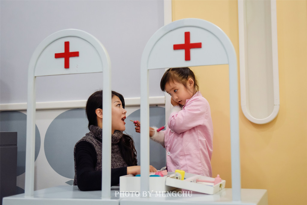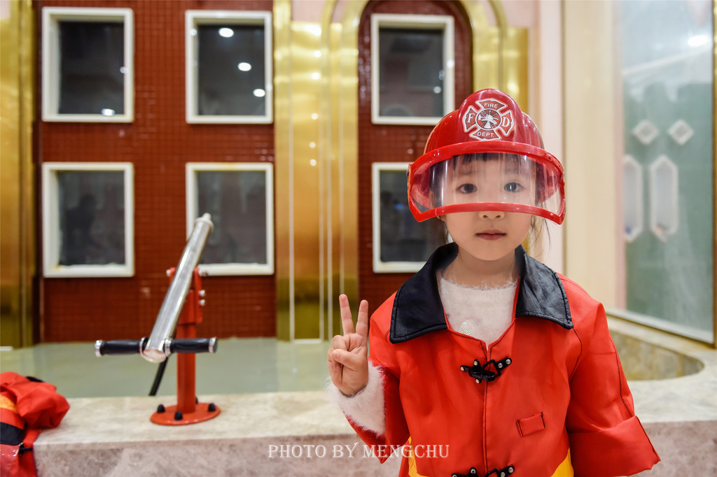 门口的安静区域比较适合小宝宝,有很多职业体验区域,可以换上制服体验模拟医院、模拟银行、模拟超市,其中最受欢迎的是小小消防员的体验,穿上消防服去灭火,真的很帅气呢!
