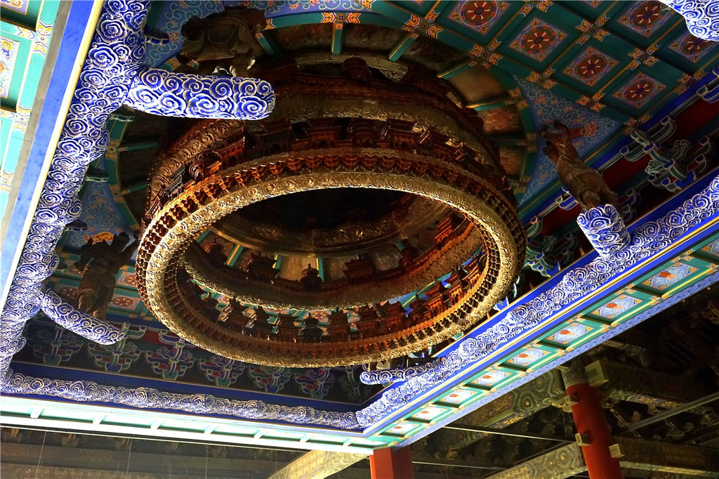 太岁殿展陈的国家一级文物隆福寺藻井,吸引着人们的眼球。精细的雕刻,润泽的色彩,这座藻井距今已经有568年的历史,原本在京城的隆福寺,1976年唐山大地震受损后曾一度放在西黄寺,直至北京古建筑博物馆建立后,才移到这里。在一个展厅,透过光亮的门扇,呈现给人们一幅精美的艺术品。古代建筑艺术在这里随处可见。