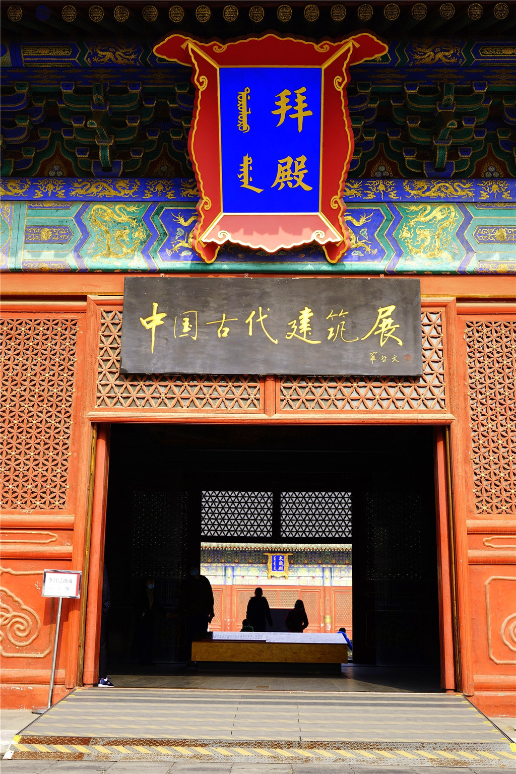 展厅中不仅能够看到详实的图片资料,还可以看到作为展厅古建的本来面目。拜殿既是太岁殿院落的穿殿,也是官员代祭太岁神的祭拜之处。走进大殿就能隔门看到太岁殿,一个气势宏伟的建筑。抬头看到上方的木雕图案,精美、霸气。