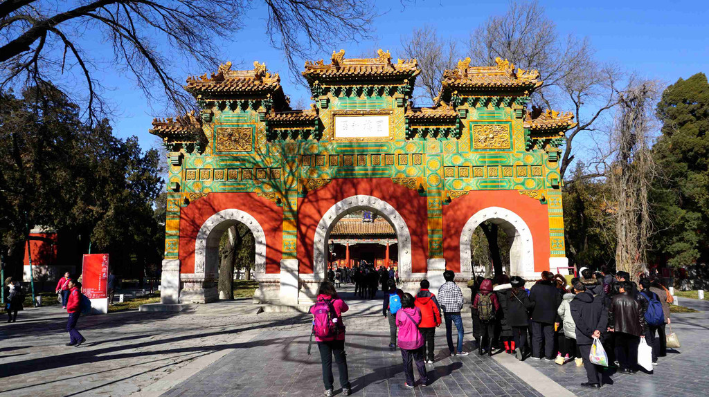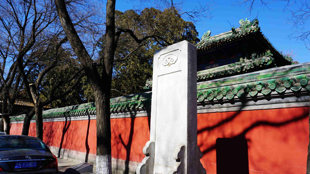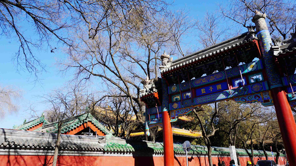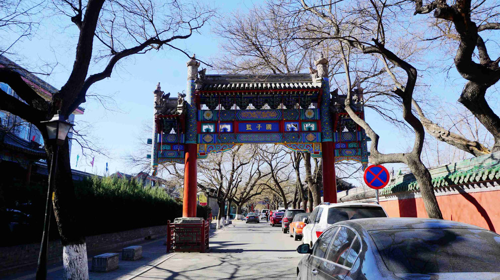 国子监街是北京城内现存不多的古老街道之一,巍然耸立的牌楼,夹道的老槐树,体现了老北京街道的面貌。