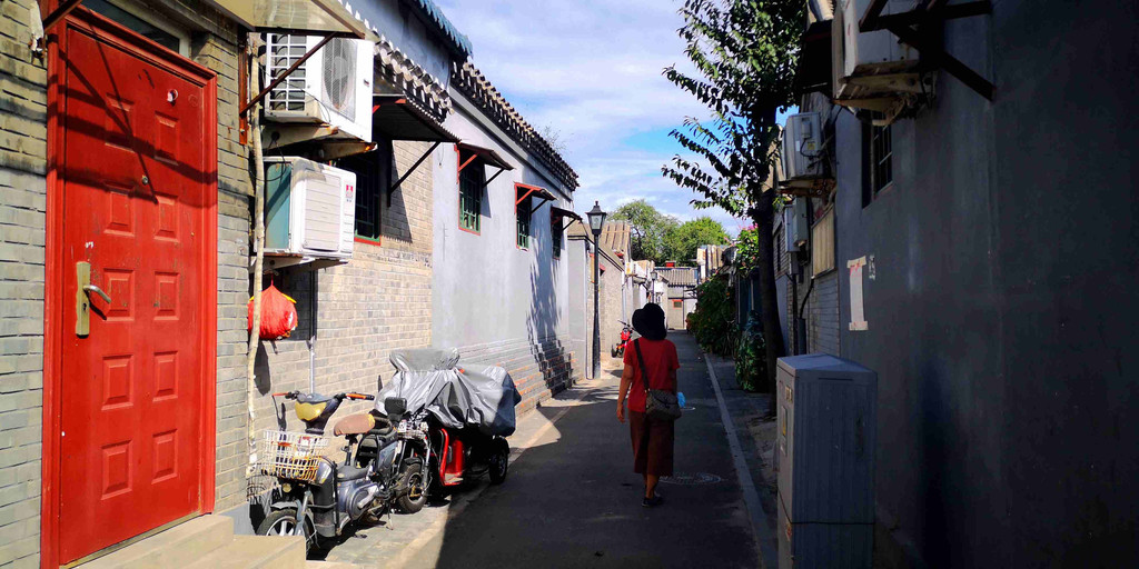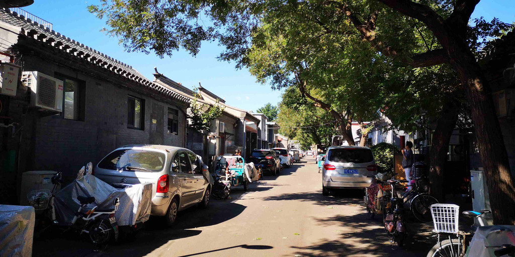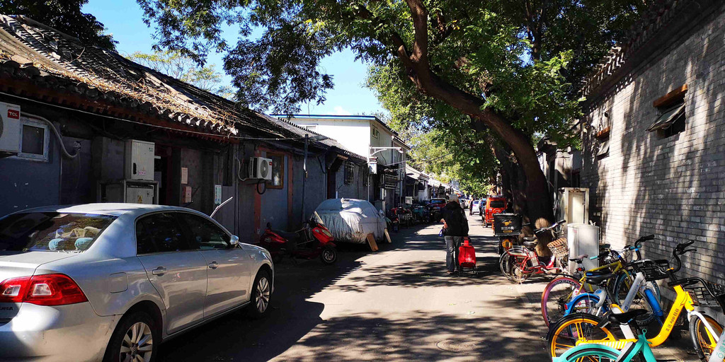 四合院内的住户,家中无厕所,各种小车随意停放在大门外,胡同内公厕数十步可见一座,生活质量一般般。