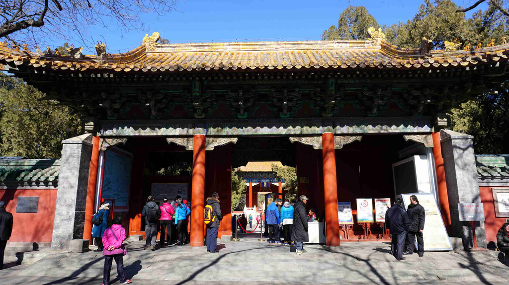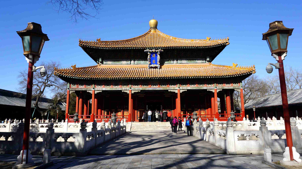 国子监中轴线上分布着集贤门(大门)、太学门(二门)、琉璃牌坊、辟雍、彝伦堂、敬一亭等建筑。