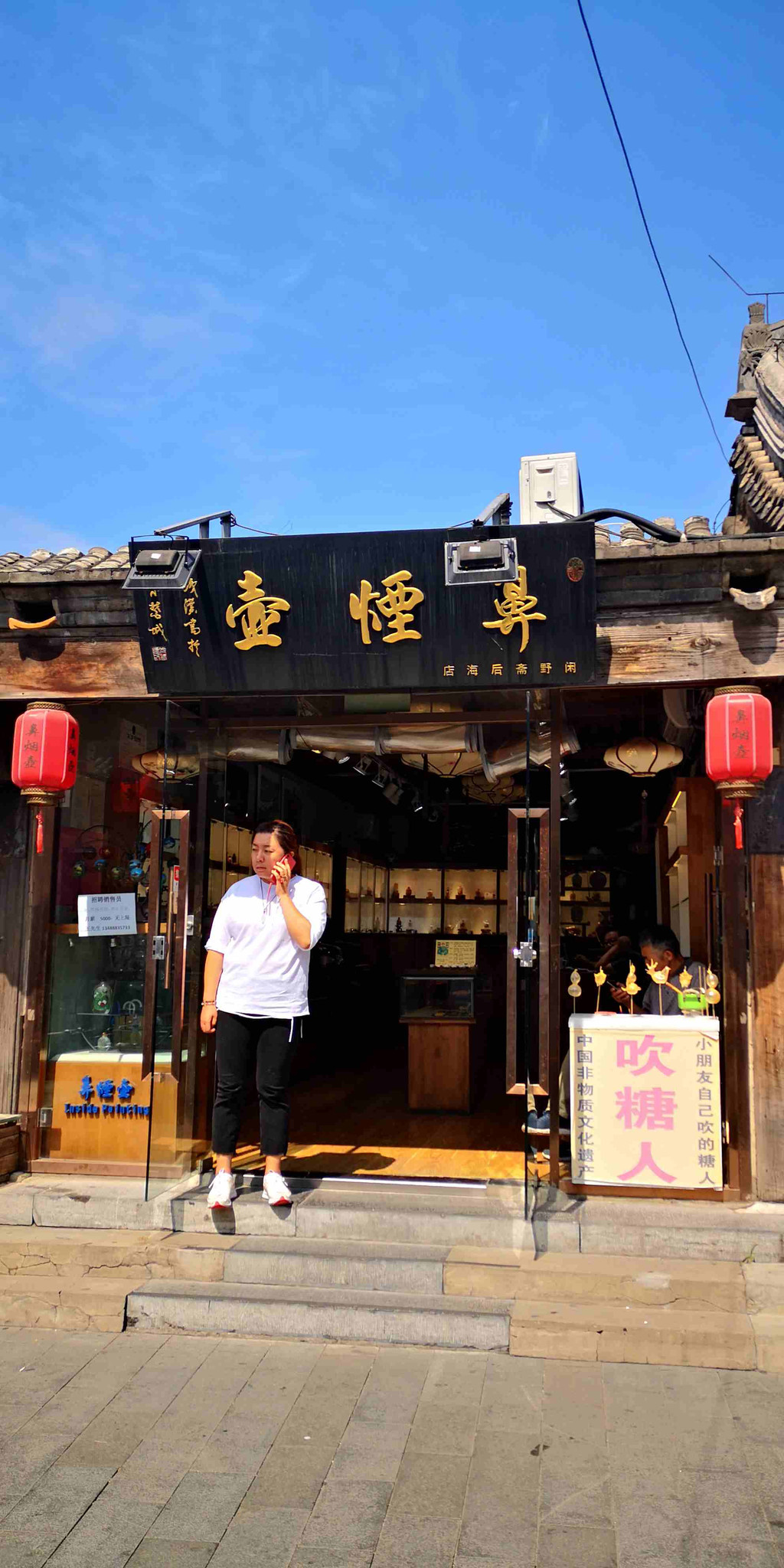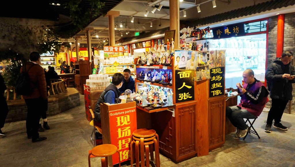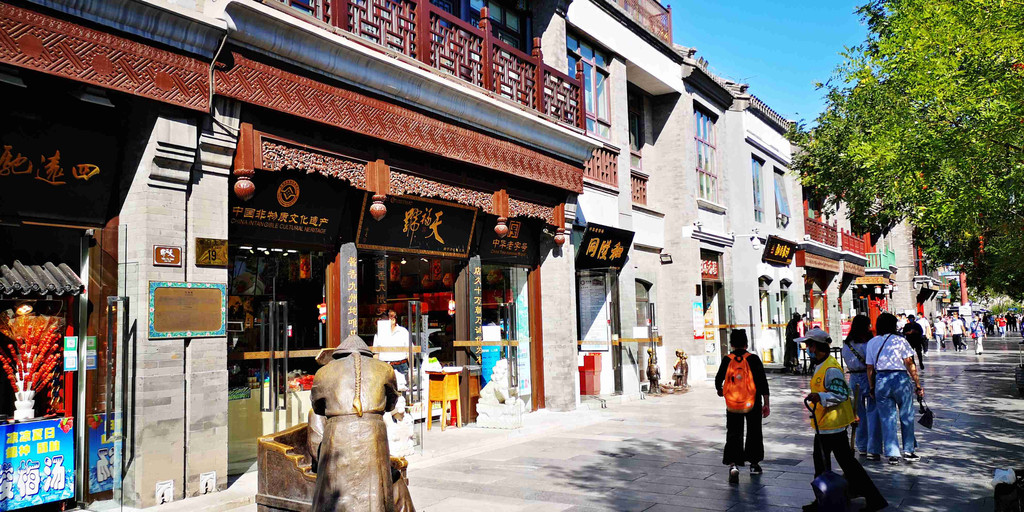 在大栅栏商业文化老街内,有众多如"面人郎"面塑、京派内画--鼻烟壶、绢花、木雕小器作、东来顺饮食文化等北京非物质文化遗产摊位和饭店。