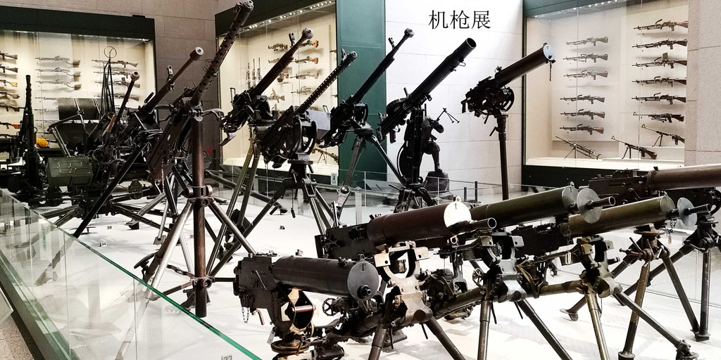 兵器陈列第二个展区是二层楼的3个回廊上陈列的手枪、步枪、冲锋枪、机枪、弹药、刀具等。