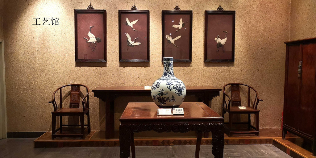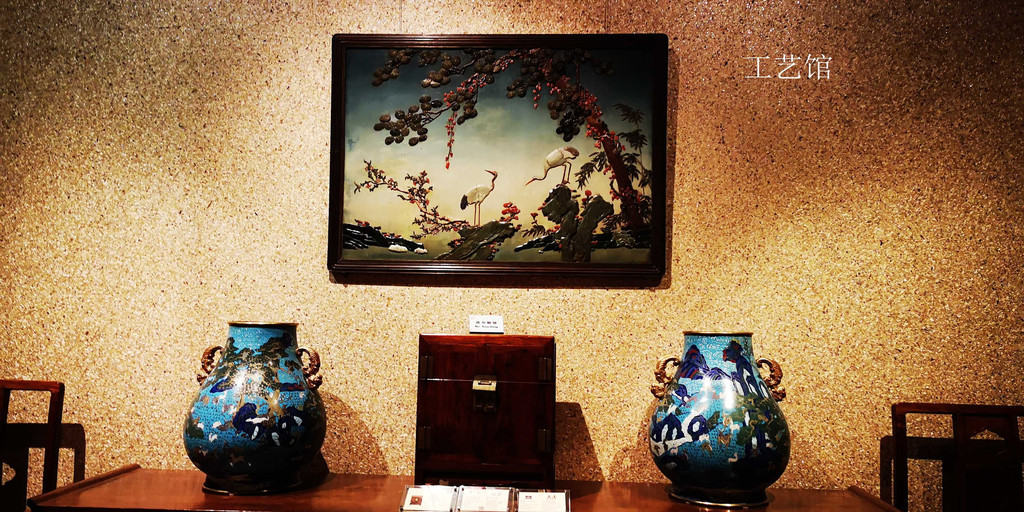 工艺馆展出古代工艺品,展出了景泰蓝、文房用具、铜器、漆器、铜胎画珐琅器等。