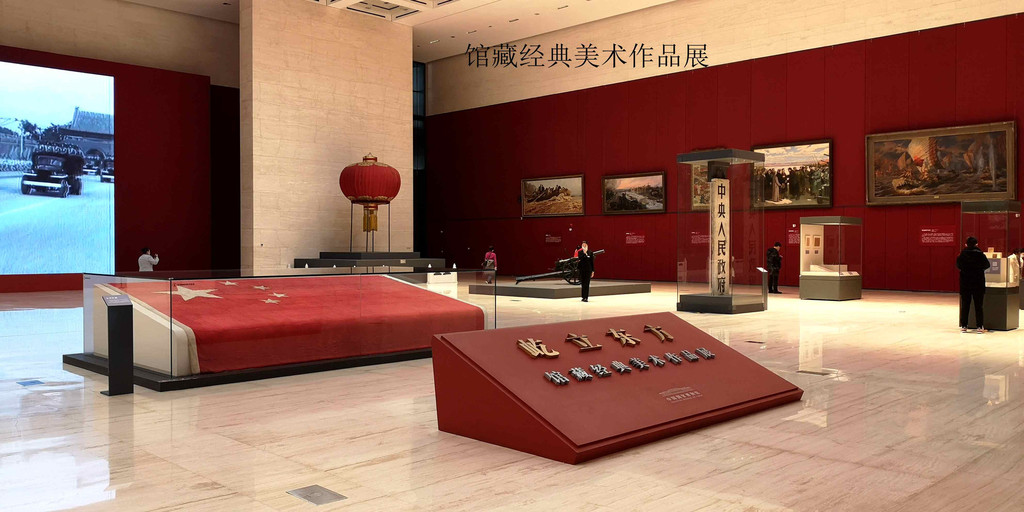 馆藏经典美术作品展有,开国大典上毛主席升起第一面五星红旗,使用的话筒、礼炮,天安门城楼上悬挂的大红灯笼;第一块中央人民政府挂牌,政务院各部门的印章;《开国大典》、《狼牙山五壮士》等新中国经典美术作品等。