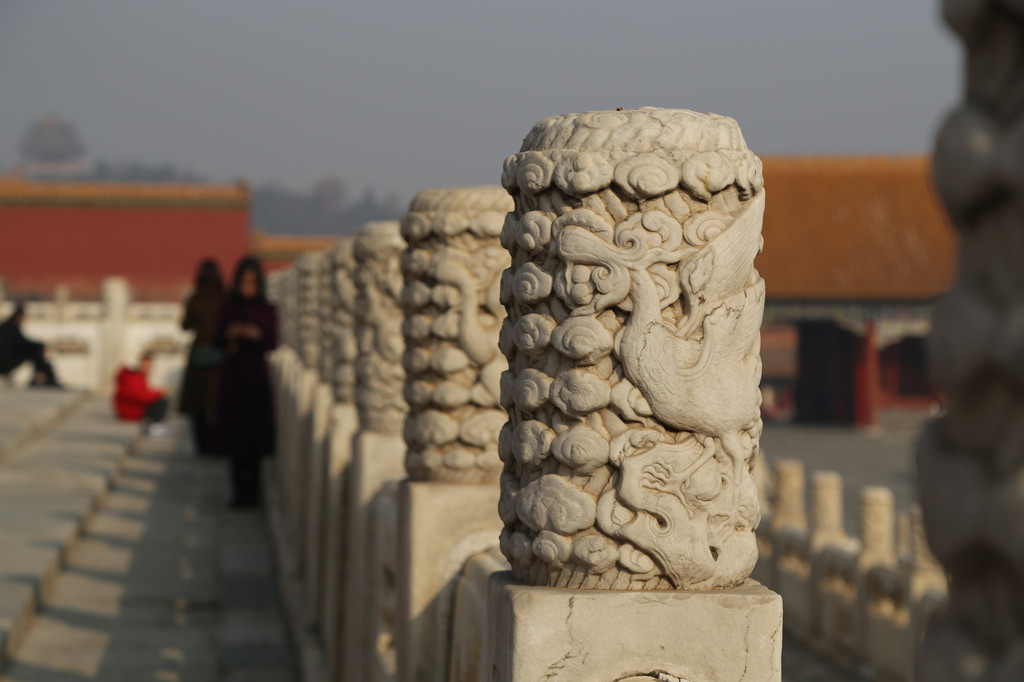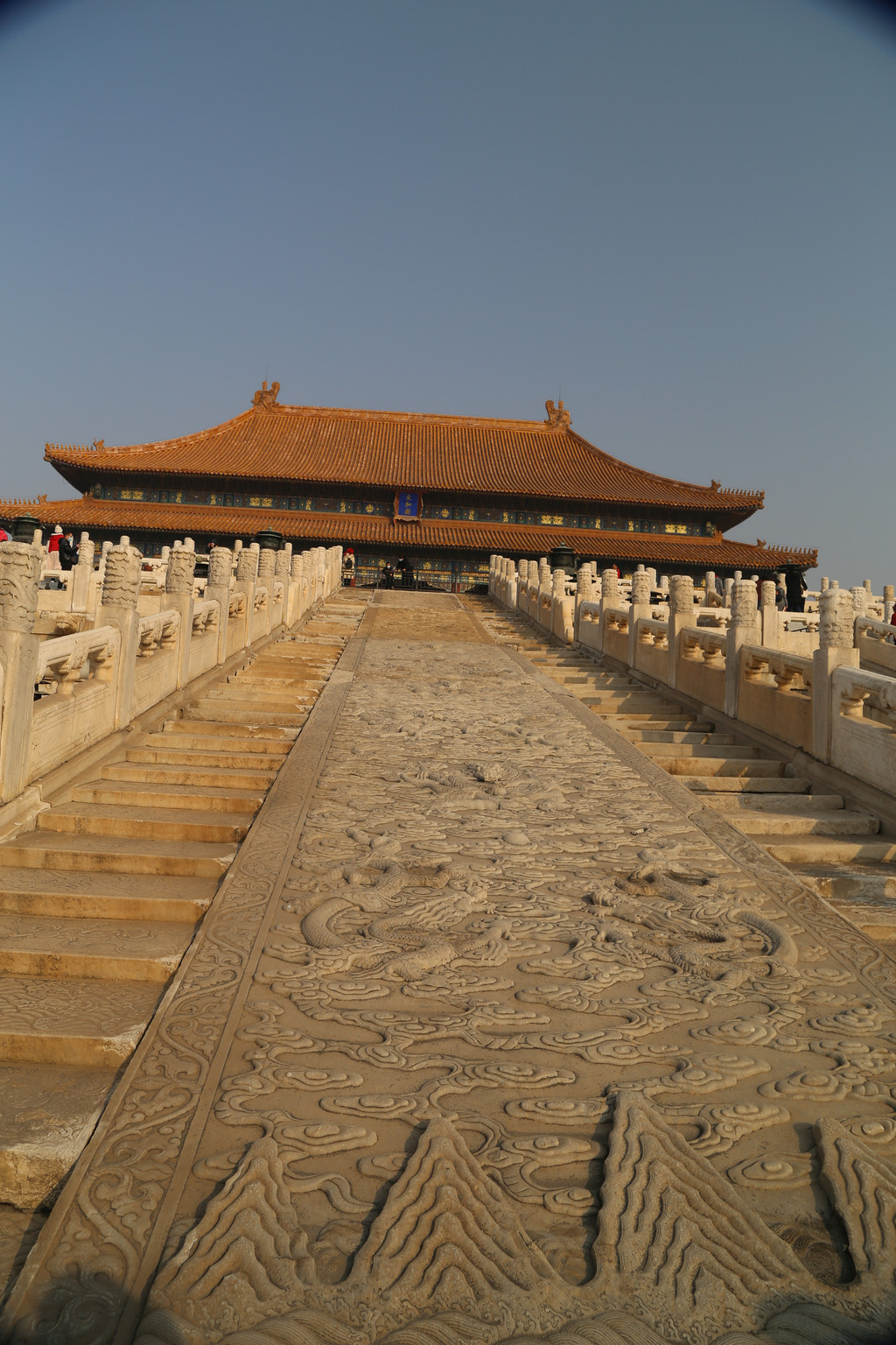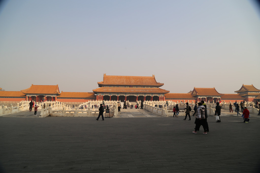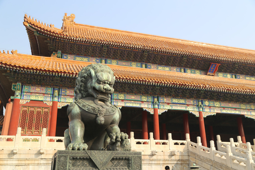 过午门、金水桥,就到了太和门,延太和门北行,就到了三大殿-太和殿、中和殿、保和殿,太和殿门前的铜狮子是故宫中最大的狮子。