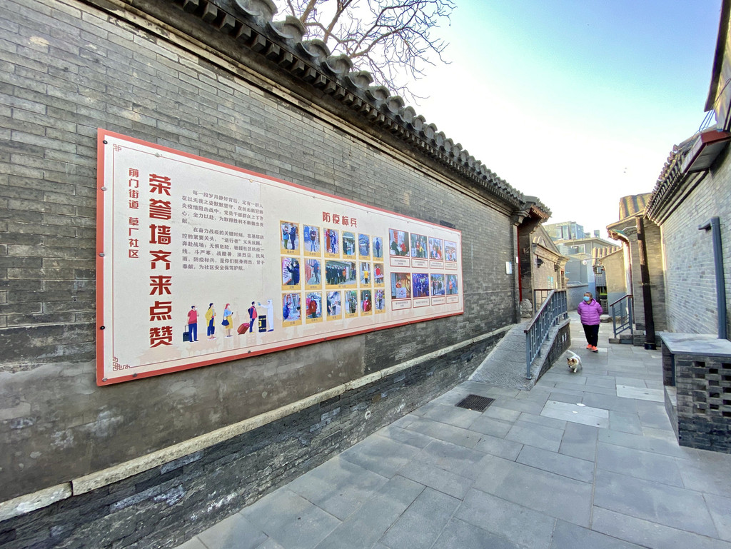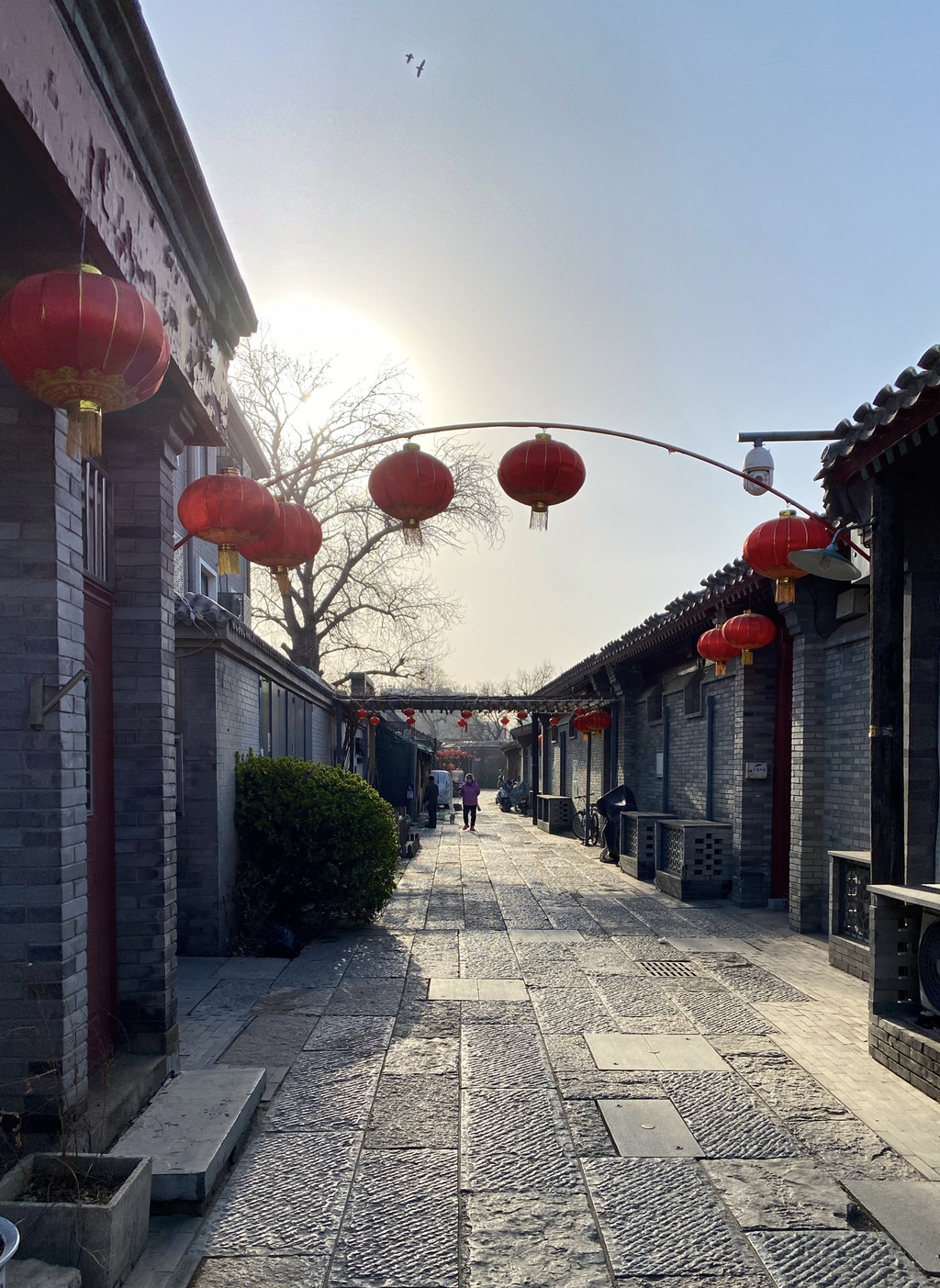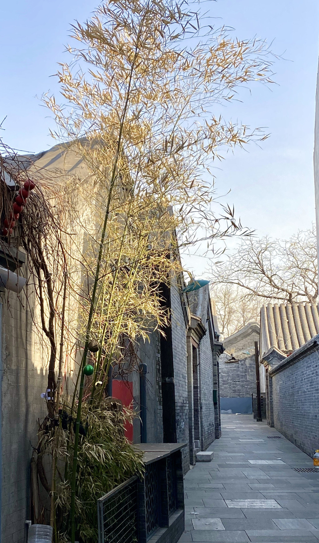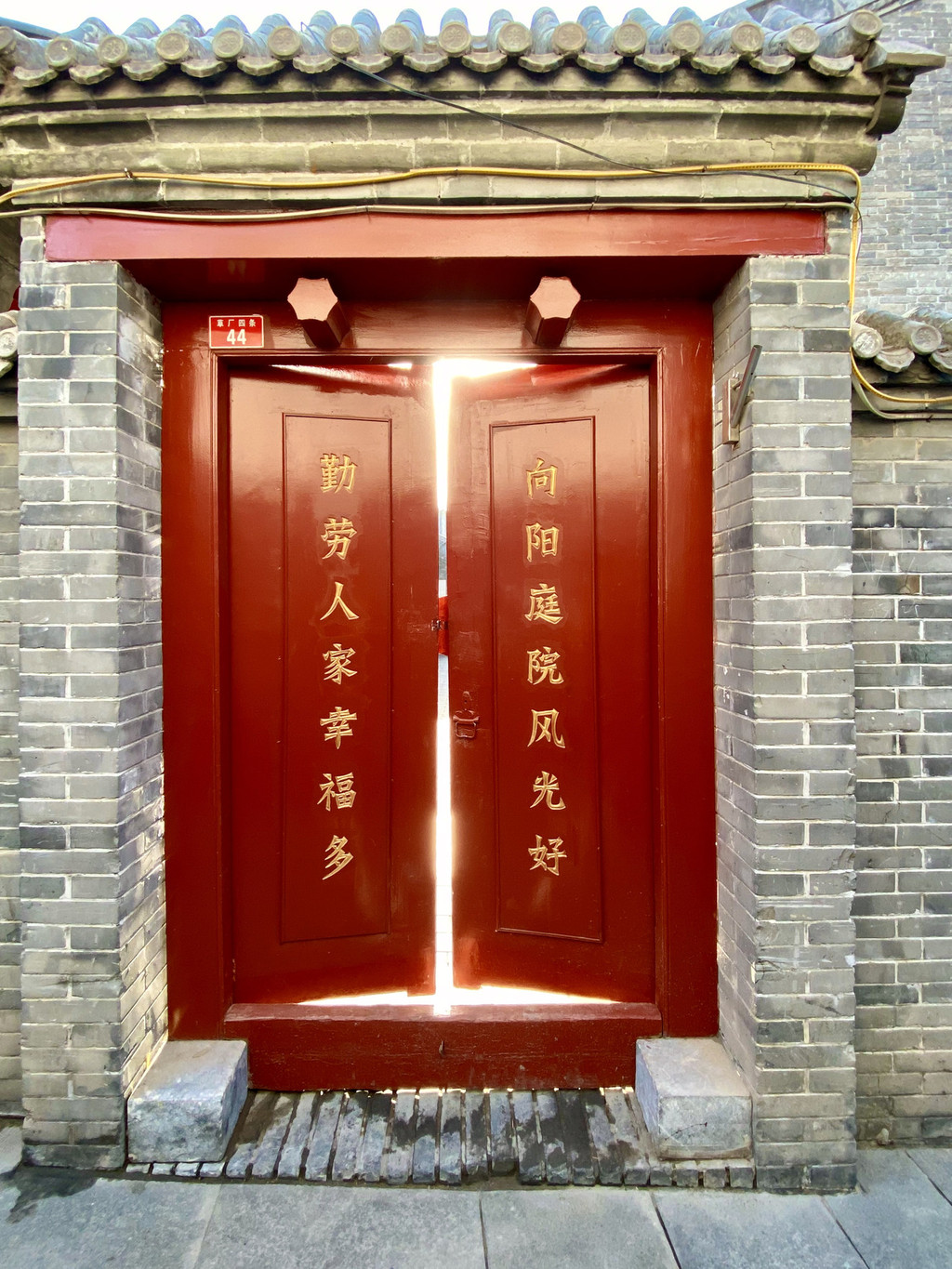 清晨从三里河公园出来,走进草厂四条。胡同很窄,石板路面干净泛着光,两侧青砖灰瓦四合院的大红门上贴着对联。