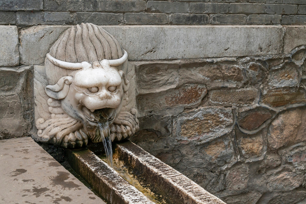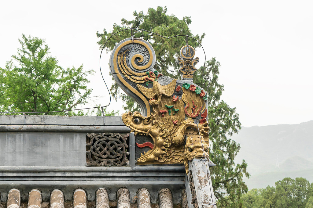 这是清代时期按照原来的元代鸱吻重做的,上面还用铁片勒着,铁片上系着金链子。那金链子比中国历届首富脖子上的金链子都粗。传说当年清康熙帝来寺里烧香,走到大雄宝殿前一抬头,发现正脊上的鸱吻Too Old。他便把自己脖子上的金链子解下来送给寺里大和尚,让他回头把那鸱吻勒住,别掉下来砸着人。所有建筑的鸱吻上只有潭柘寺才有这个金链子,海内海外普天下仅此一例,潭柘寺宝物之一。幸亏这是清代之物,若是宋代皇上所赐,肯定留不到这会儿,早被时迁摸走了。时迁之后,天下无贼。