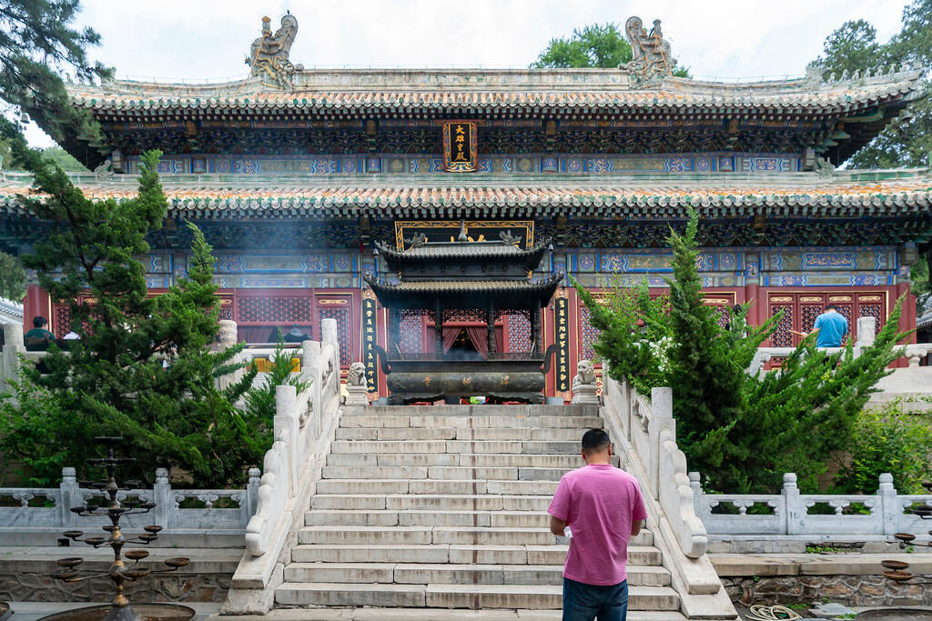 沿着大雄宝殿檐下月台,可以走到殿后,有踏跺登上下一层平台。大雄宝殿月台下两侧也有爬梯让你登上下一层平台。