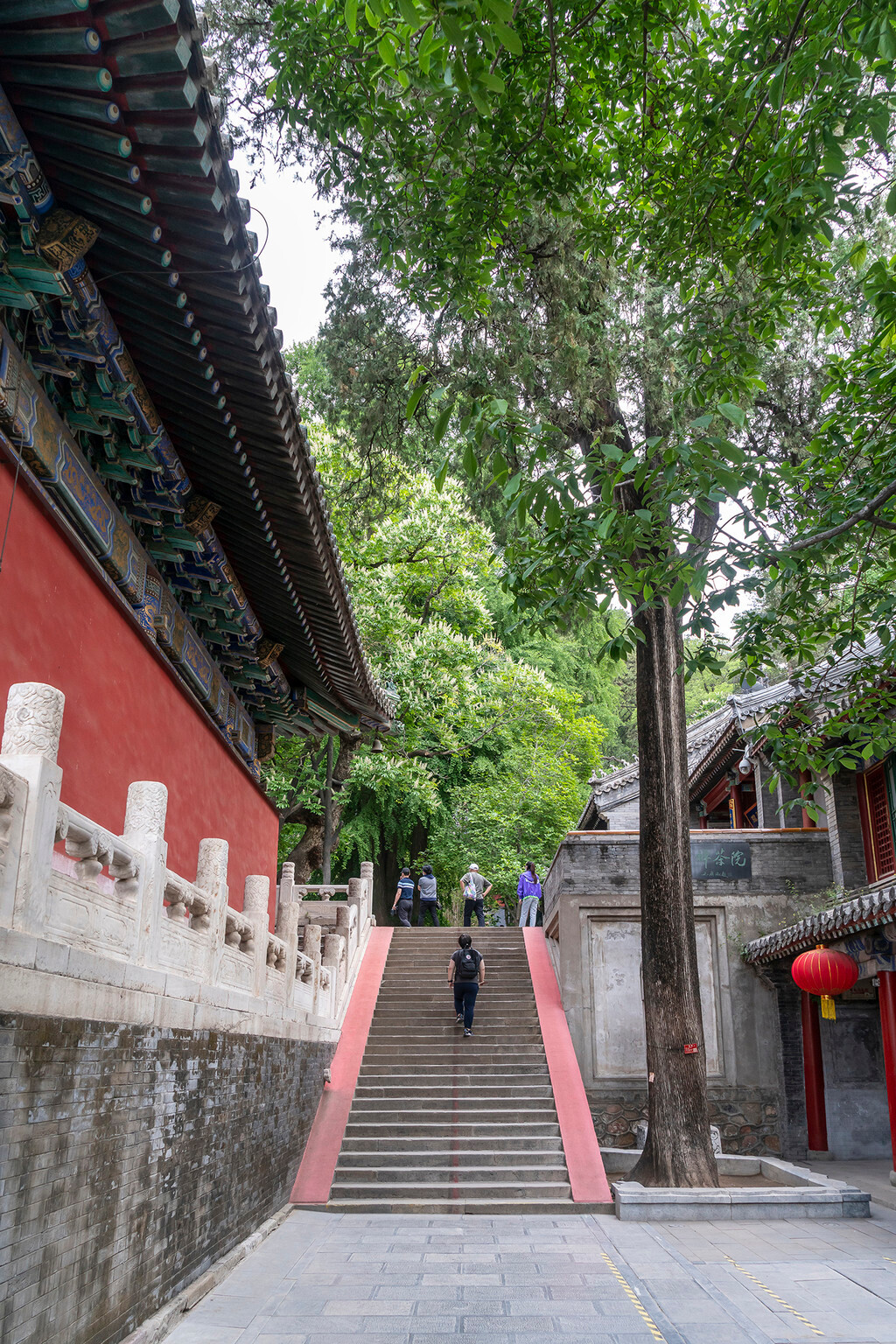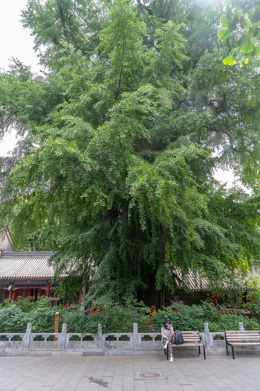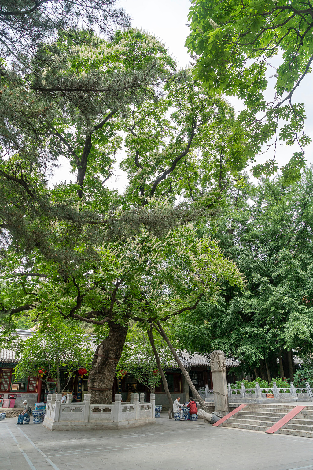 佛寺种菩提树是有讲的,因为释迦牟尼在菩提树下冥想七天七夜,终得大彻大悟,成为佛祖。相比达摩面壁十年,佛祖冥想七天即成佛,所以可想释迦牟尼的功力是非常强大的。但是北京无法栽培菩提树,怎么办呢?北京地区的佛寺就种娑罗树,一种七叶乔木。我上次在云居寺也见到此树,但那寺里的工作人员伪称其是菩提树。潭柘寺的这二棵娑罗树据称有六百年高龄,可是他们后面的二棵银杏树都已经超过一千年了。东面的那棵银杏叫做帝王树,就是我上面图片中的那一棵。寺里的志愿者说每当有新皇上登基,就会有一棵新枝从树根长出来;每当有皇上驾崩,树上就会掉下来一根树杈。我问他这是从哪个朝代开始的神迹?他说忘了。我问他外国的皇上算吗?他说好像不算。我不好再往下问了。我就走到下一层平台的爬梯下向上观望。