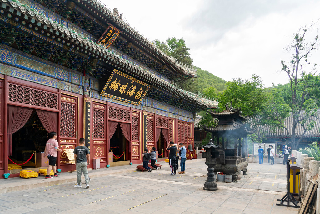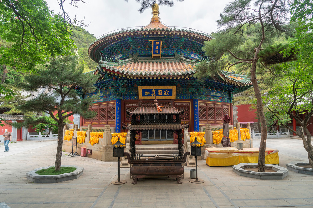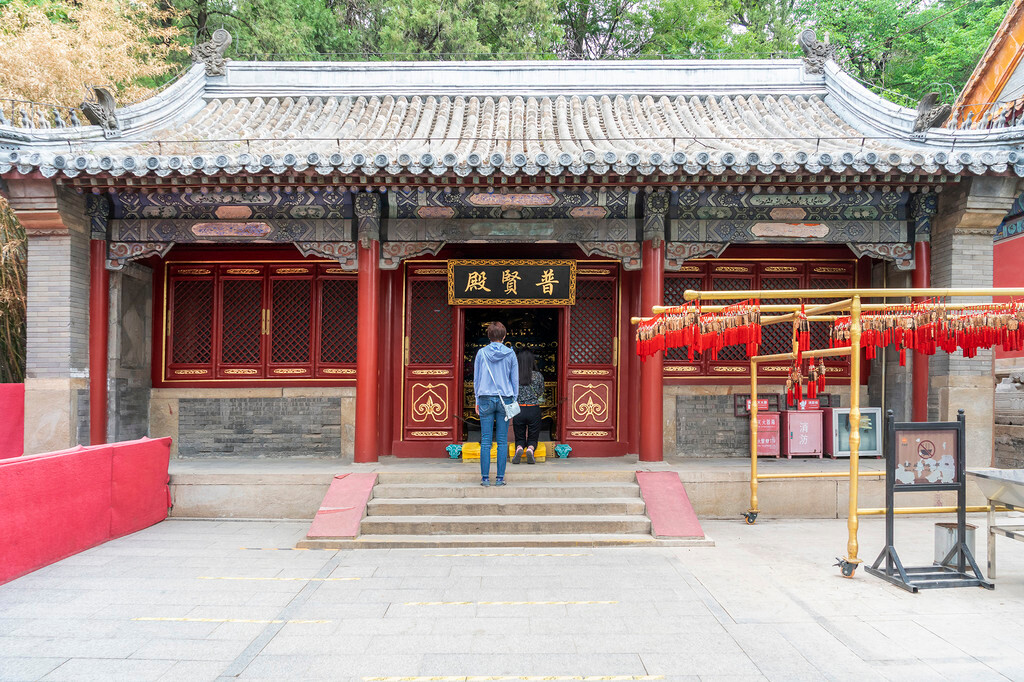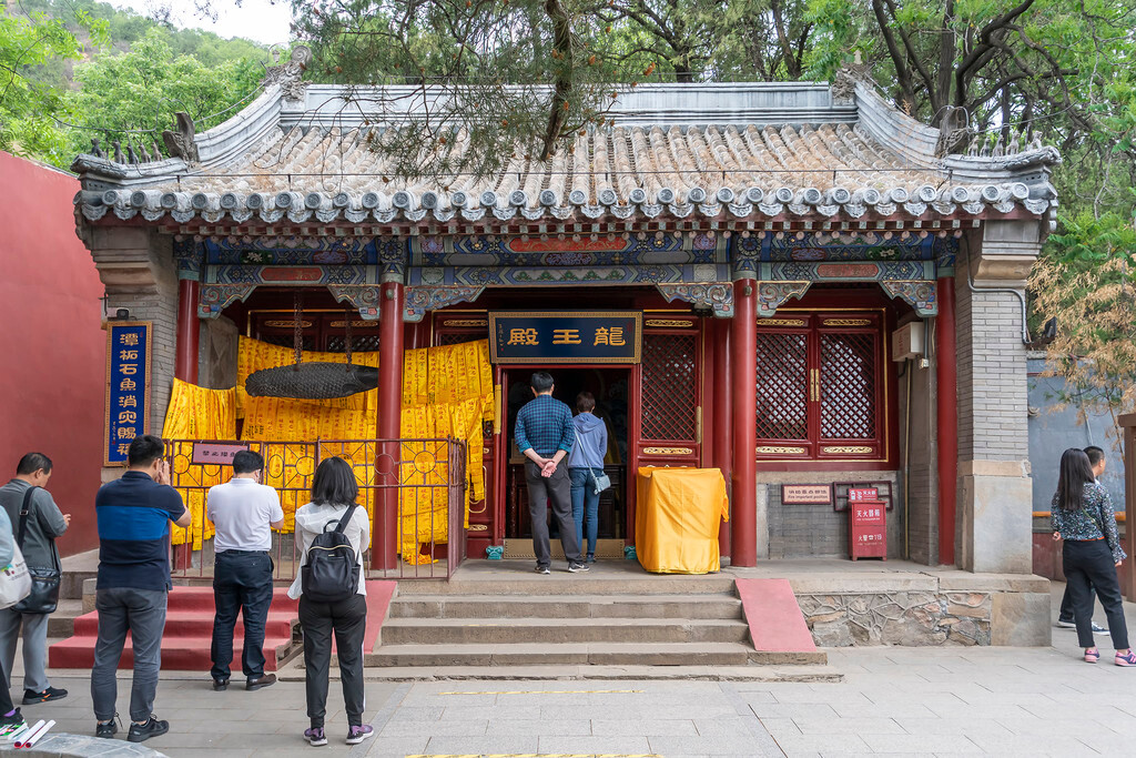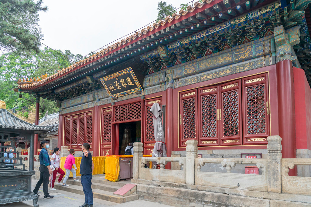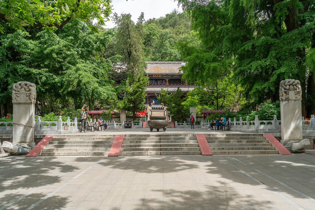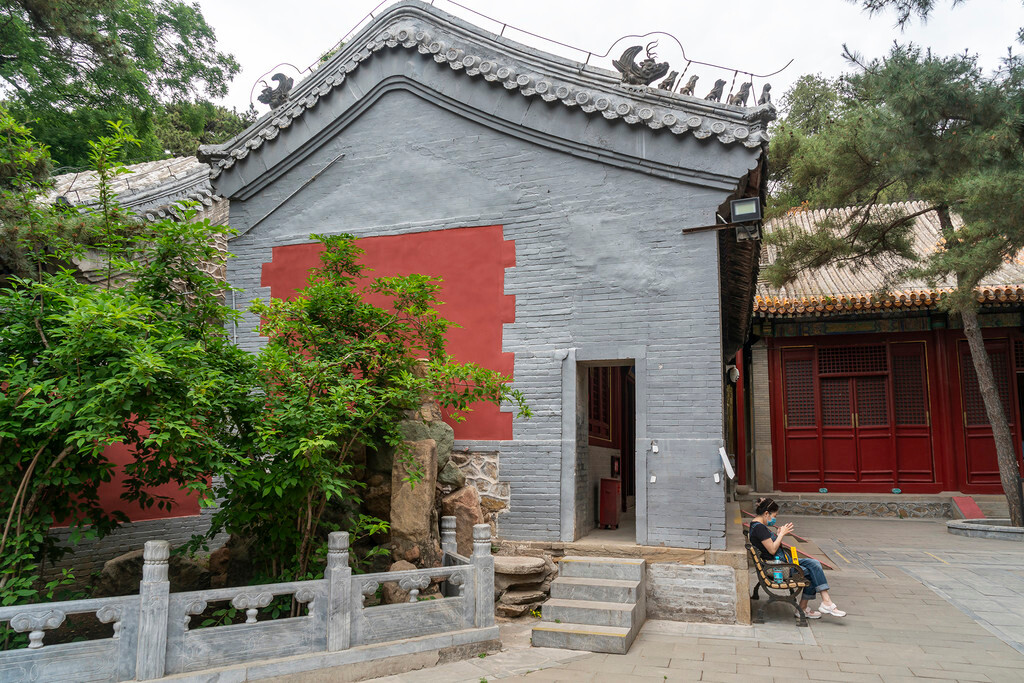看完地藏殿,我就从其旁向上攀登,于红尘中奔走。在那片红尘中就可以看到金刚延寿塔的后背,还有毗卢阁屋顶的后坡,包括精美的脊吻。在山上走到潭柘寺西路,就有并排的三座殿。中间是一座大号的,观音殿。