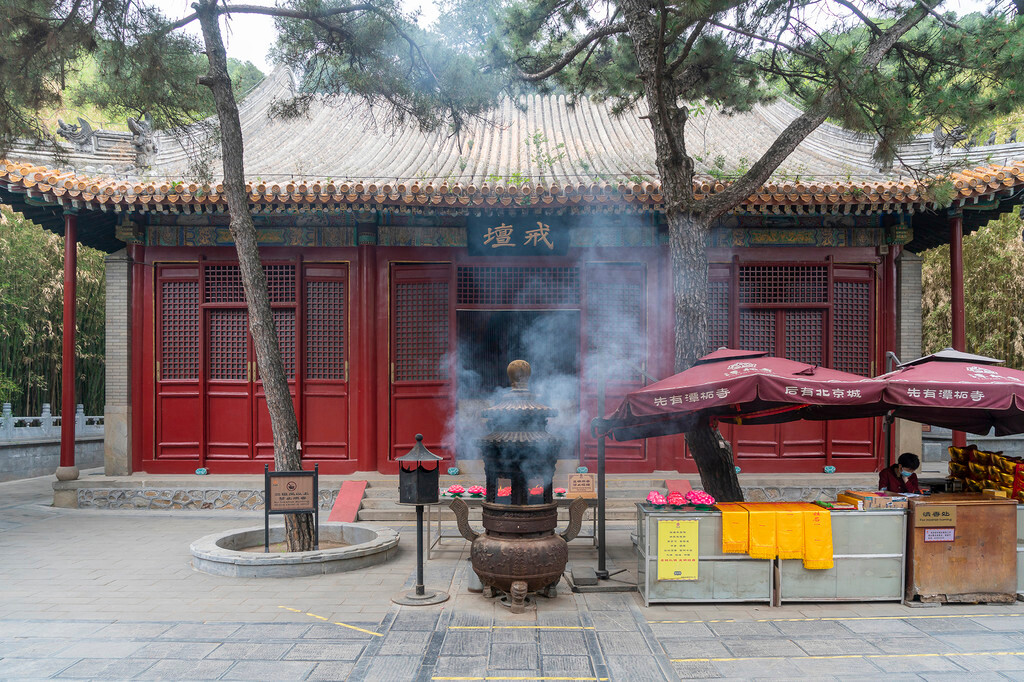 戒坛是三层汉白玉须弥座,上面有佛像。戒台上空间不大,三证七师都要坐下还是挺挤的。这座戒坛没有隔壁戒台寺的戒坛大,但是因为潭柘寺是大刹,这里也可以授僧人比丘戒,也算是大戒。戒坛殿后藏着一尊铜香炉,很高级,不知道为什么藏在殿后。