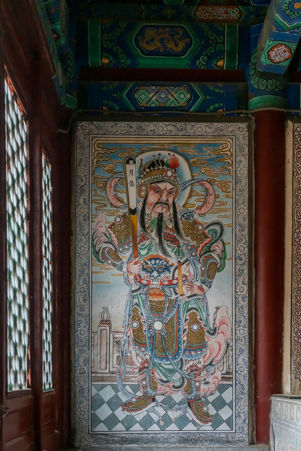天王殿两边炕上站着四大天王,这个不新鲜。墙上还有汉将壁画,那是四值功曹,就是值年、值月、值日和值时,都是神仙。四值功曹属于天兵天将中的天将,道教中的保护神。玉皇大帝张罗天罗地网捉拿孙悟空时,四值功曹就曾出力。看看下面这个值月神黄承乙。佛寺中盖一座小神庙的不稀奇,什么关公殿、财神殿的都有,但是像潭柘寺这样在佛殿中挂神像的还真是不多见。
