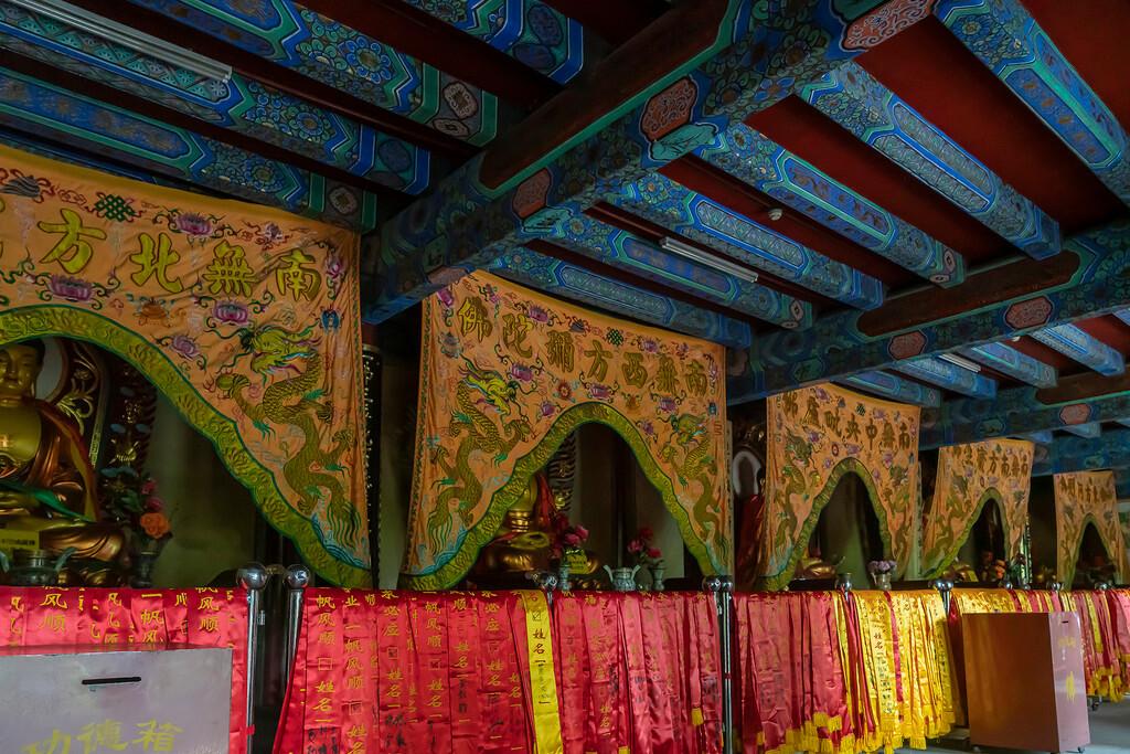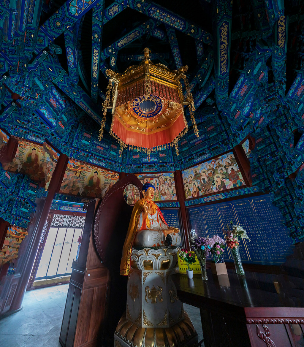 室内还有内室,中间是彩绘木刻释迦牟尼坐像。在一片暗淡的蓝色基调中,暖色的佛像和华盖非常夺目,极为漂亮。抬头看看上面结构。