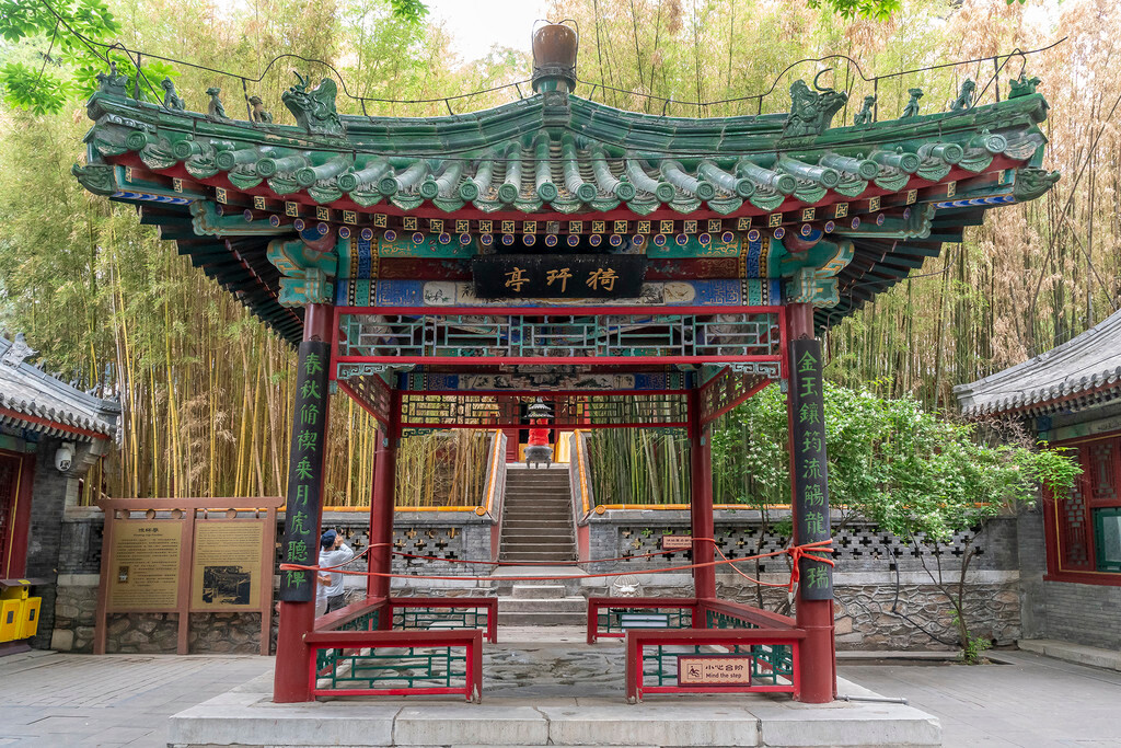 方丈院深处还有一座小院,非常僻静。院中有一座方亭,檐下挂着清乾隆帝题的“猗玕亭(念乙肝亭)”横匾,这是俗称叫做流杯亭的那座亭子。