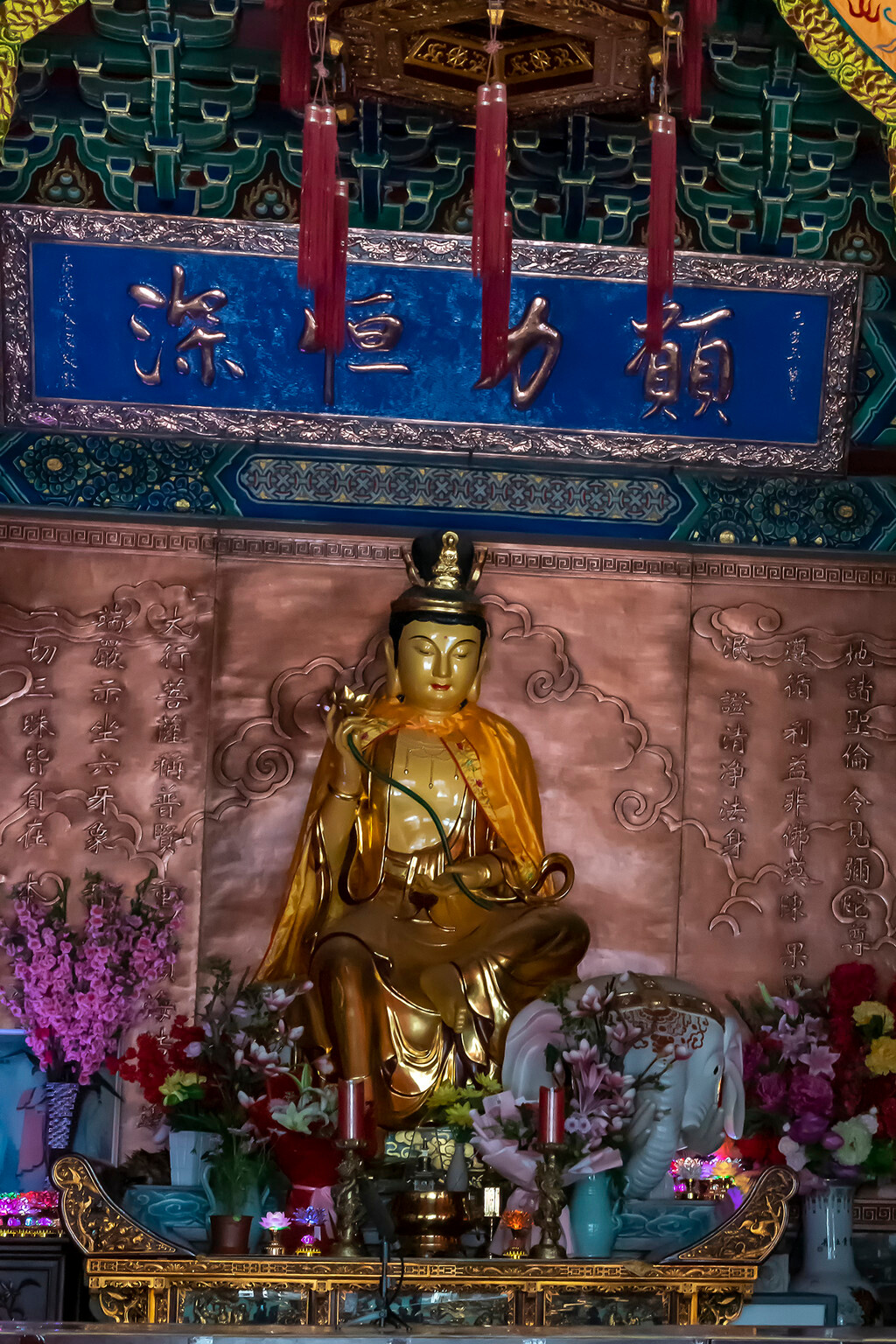 这座大雄宝殿面阔五间进深三间,上面是斗拱抬梁结构,黄色琉璃瓦绿剪边重檐庑殿顶,七只脊兽,贴金双龙和玺彩绘,规格等级相当高,表现出皇家敕建的身份。前面明间加东西次间开门,梢间槛墙槛窗,门窗上都是三交六椀棂花,居然还有贴金。东西山墙是实墙不开窗,后面是明间开门。前面挂着两块匾,上面是赵朴初先生所题“大雄宝殿”贴金斗匾,下面是清乾隆所题“福海珠轮”纸匾。再回过头去看了一眼天王殿额匾,应该也是赵朴初先生重题。