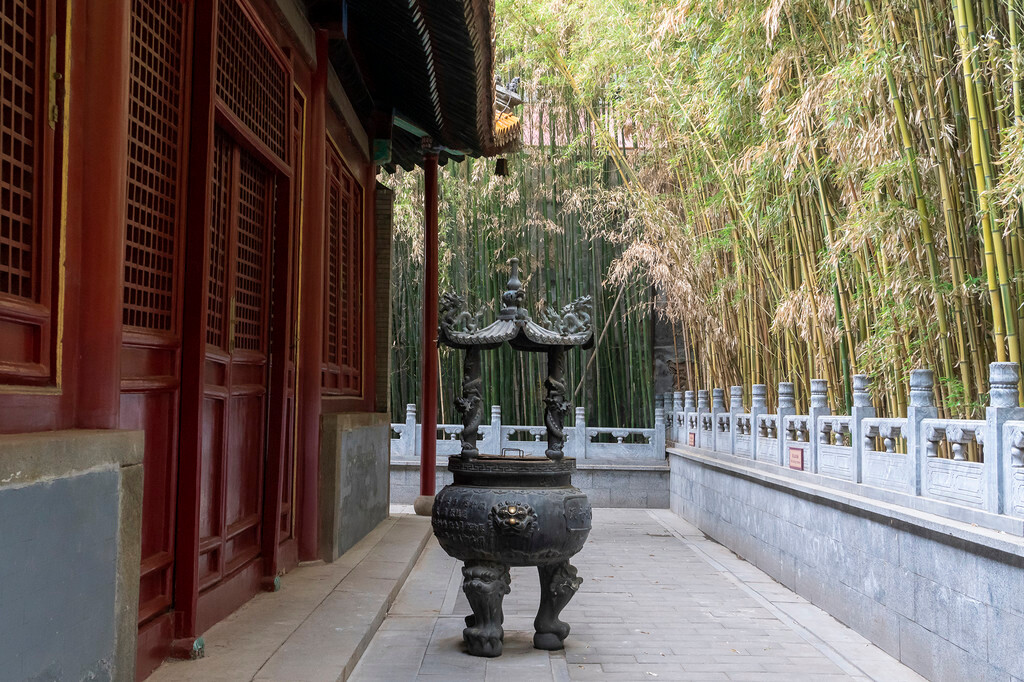 这是方丈院。方丈院是一座四合院,正房坐北朝南,面阔五间,住方丈的。院内古柏参天,还有一口青铜水缸,方丈取水不用远行。