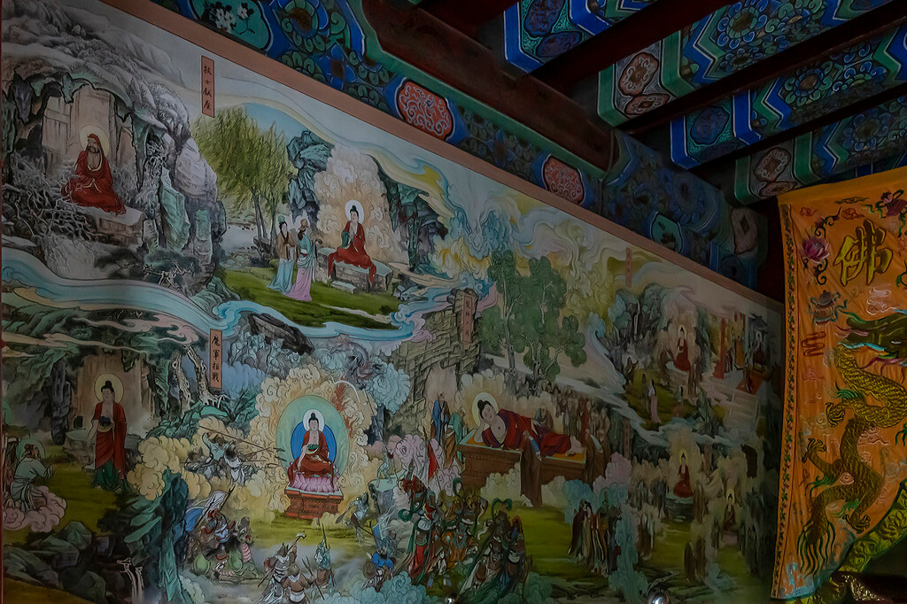 毗卢阁内一层东西墙上都是通景壁画,佛家故事连环画。看看西墙上的壁画局部。