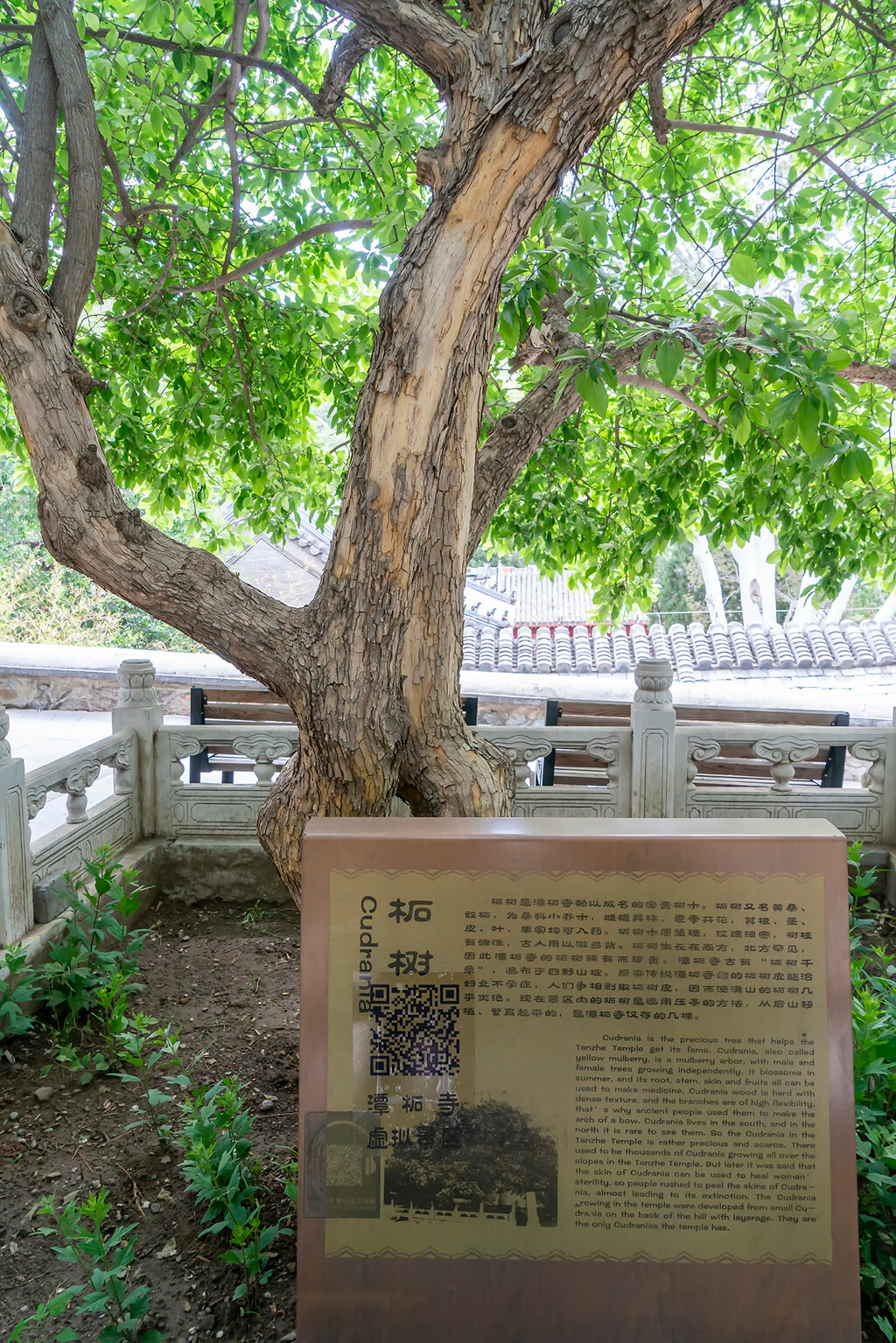 潭柘寺的寺名从来没有叫过“潭柘寺”,这个潭柘寺是民间称呼。因为寺后有一眼泉水积出来的龙潭,再加上山上的柘树,因此民间称此寺为潭柘寺。柘树在南方叫黄桑,只因寺后宝珠峰风水适宜,这里才生出来一些柘树。有医术不高者言这树皮能帮人家中增丁,便不断有人上山剥树皮,回家泡药酒给老婆喝。长此以往,山中柘树就难以为继,现今除了这棵便天下难寻了。