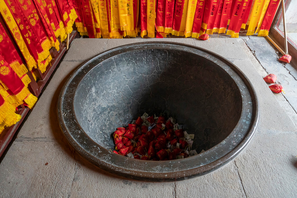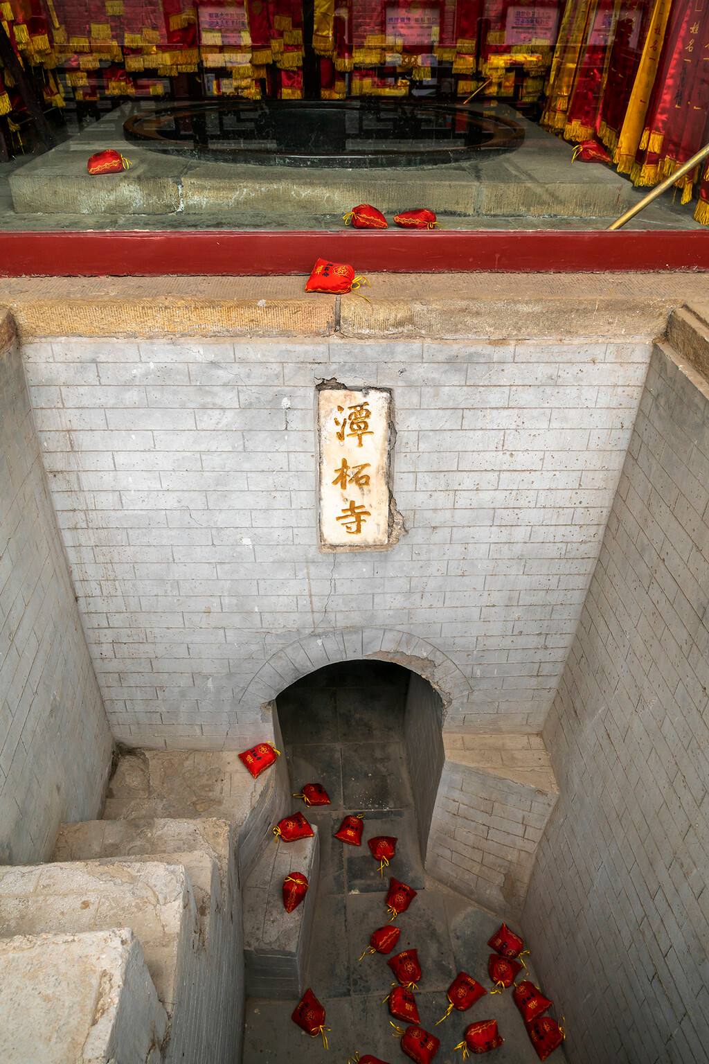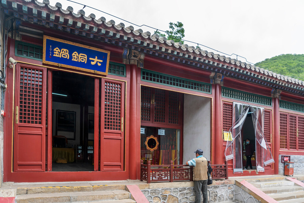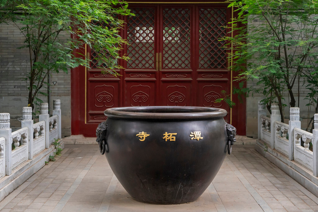 这是潭柘寺三口铜锅之小锅,过去炒菜用的。熬粥、蒸馍的大锅都丢了,那二口锅更大。据说粥锅之大需要伙夫僧搭梯子下去刷锅,而且若有过路僧来寺里蹭饭的话,那伙夫僧便往锅里兑水,却不加料。炉门上刻着“潭柘寺”,说是为了防火。让这三个字替潭柘寺在这里挨烟熏火燎,火就不再去烧大殿了。这有点大禹治水的意思,改堵为疏。