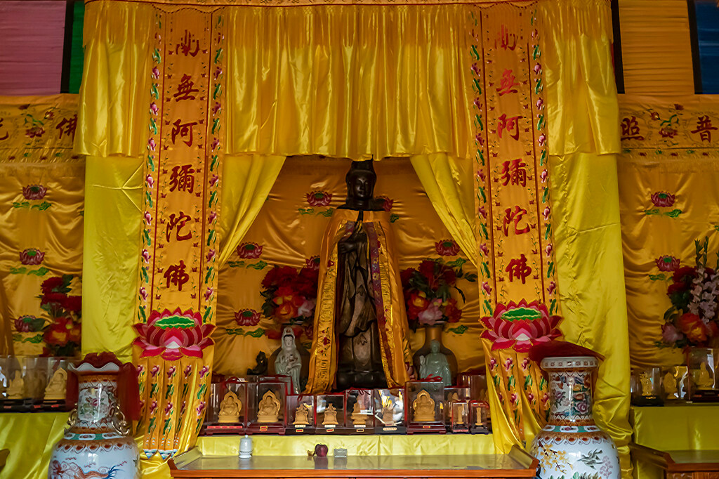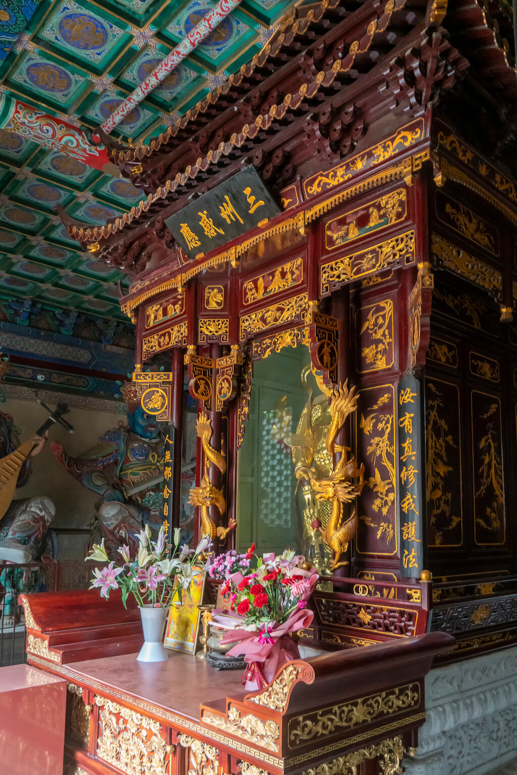 内部是贴金蟠龙平棋天花,佛龛相当华丽,都是贴金木刻浮雕。