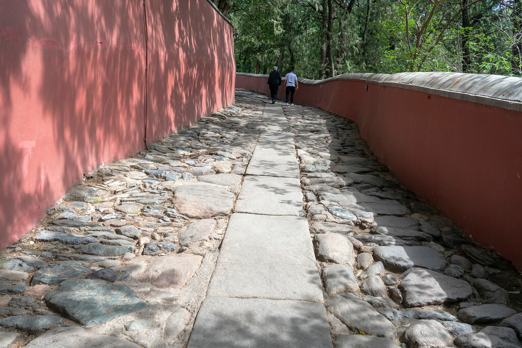 你别看这条石板路破陋,它两边是有红墙的。你再看中间的那路青石板,这是御路的配置呀。金煦宗完颜亶(念蛋)是不是走的这条路进寺我不知道,但乾隆是肯定走这条路来潭柘寺烧香的,当然其时有人给他抬轿子。