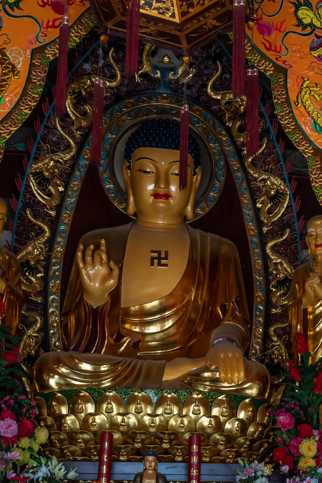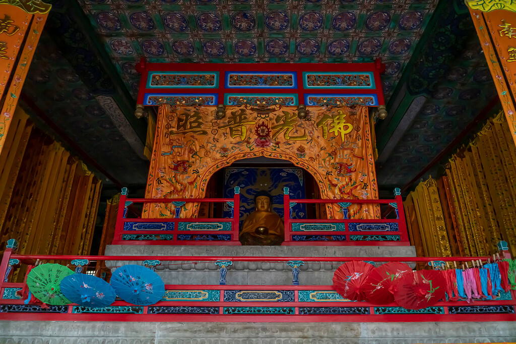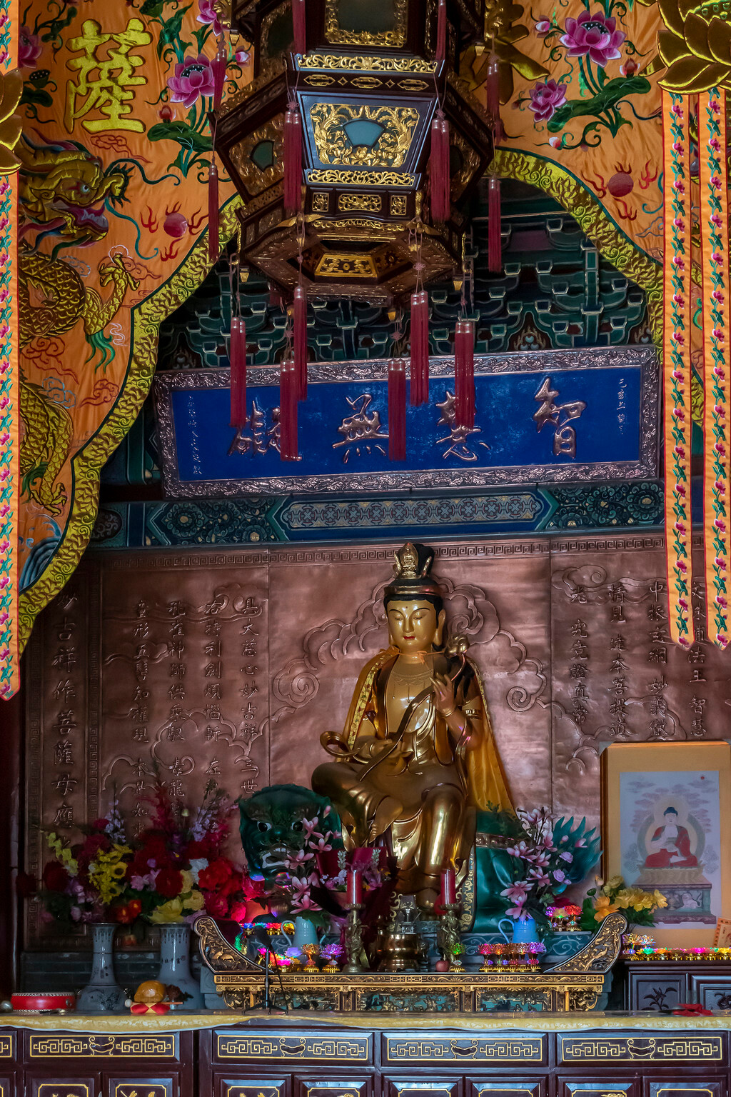殿内供五方佛,这是汉传密宗规则。中间是毗卢遮那佛,密宗叫做大日如来佛。他的左手内侧是南方宝相佛,代表平等性智;外侧是东方阿閦佛(念阿怵佛),代表大圆镜智。他的右手内侧是西方阿弥陀佛,代表妙观察智;外侧是北方不空佛,代表成所作智。四位佛代表了佛之四智,大日如来代表法界体性智,加起来是五智,所以五方佛也称五智如来。