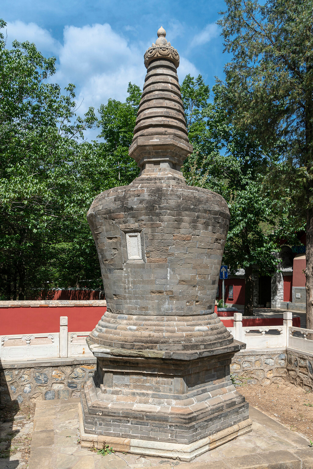 他们说这塔是明代越靖王朱瞻镛建于明正统二年(公元1437年)。这个朱瞻镛是朱棣的孙子、明宣宗朱瞻基的亲弟弟,朱棣在永乐年间封其越王,藩地在浙江衢州。朱瞻镛虽然封王,他却从来没有去衢州就藩,一直在京城逛吃。朱瞻镛是第一代越王,因为无后,他也是唯一一位明越王。死后谥号“靖”,藩地撤销。朱瞻镛在京城无事,便来潭柘寺建了这座金刚延寿塔,里面收藏了他妈张太后的生辰八字和佛经,专为太后祈寿。但是不知何故,此塔功效不佳。正统二年塔落成,正统四年朱瞻镛即故,正统七年张太后亦崩。