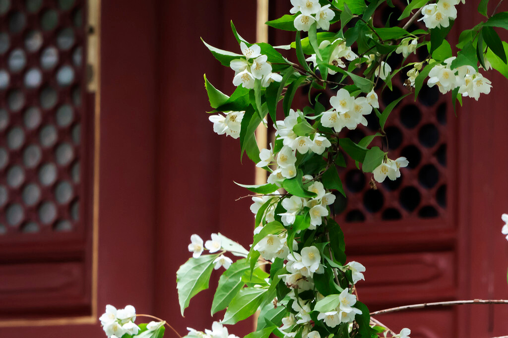 伽蓝殿门前有几棵太平花,正在盛开季节。太平花早先是南方的花,蜀中多有。曾有蜀人献花于明皇,种在皇宫后苑,现在仍然在故宫御花园绛雪轩前花坛中。太平花开时非常香,游人到此都纷纷猛嗅,然后狂喊“什么花这么香呀”?