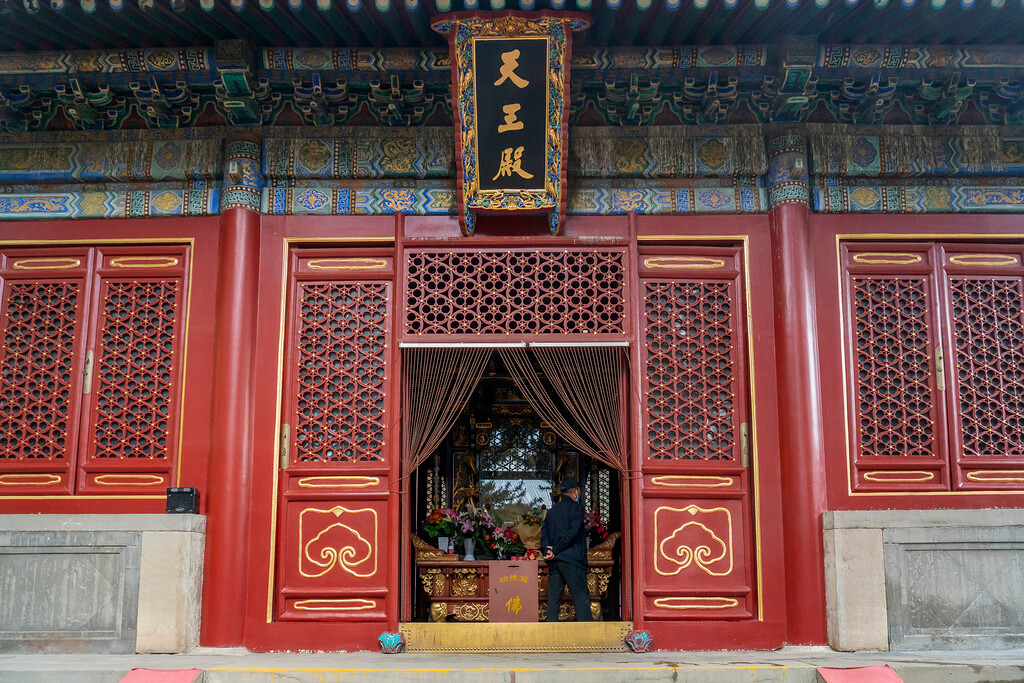 从山门内哼哈二将眼前走过,就可以进入潭柘寺。山门之后当然就是天王殿,但你别看如此简单的道理,却也不是寺寺照办。很多寺庙的山门和天王殿是合二为一的山门殿。潭柘寺依山而建,过了山门的天王殿是在上一层平台上。看看天王殿。