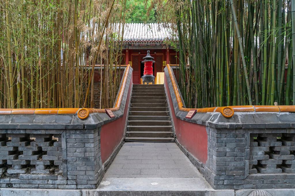 祖师殿和对面的伽蓝殿建筑形式一样。我问那位志愿者这殿内供的祖师是哪位尊者?他说真不知道,按照潭柘寺现循律宗,没准儿是律宗祖师?律宗发源于西安净业寺,实际始人是唐僧道宣。道宣曾协助玄奘翻译西天经文,后入终南山。其实,现今世上寺庙中的祖师殿通常供奉的应该都是禅宗祖师达摩,就是北魏年间在少林寺后山洞中面壁十年的那位菩提达摩。达摩为什么面壁十年?是因为他想搞佛家理论本地化,他在洞里想了十年,想出来一套理论,不用识字也可以理解佛之道理,这就是禅宗。达摩由此成为中国禅宗第一人,便是禅宗初世祖。你别说,他这套理论还挺好使,传到六世的时候,禅宗大师叫唐僧慧能和尚,他就是文盲。慧能和尚是南派禅宗,他见字需有人念给他听,想出偈语也需请秀才写在墙上。他最有名的作品是“菩提本无树,明镜亦非台;本来无一物,何处惹尘埃”。