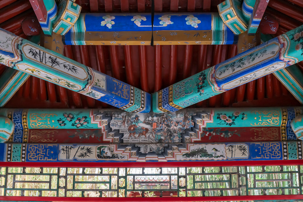 亭子内梁枋上有苏式彩绘,看看这幅。